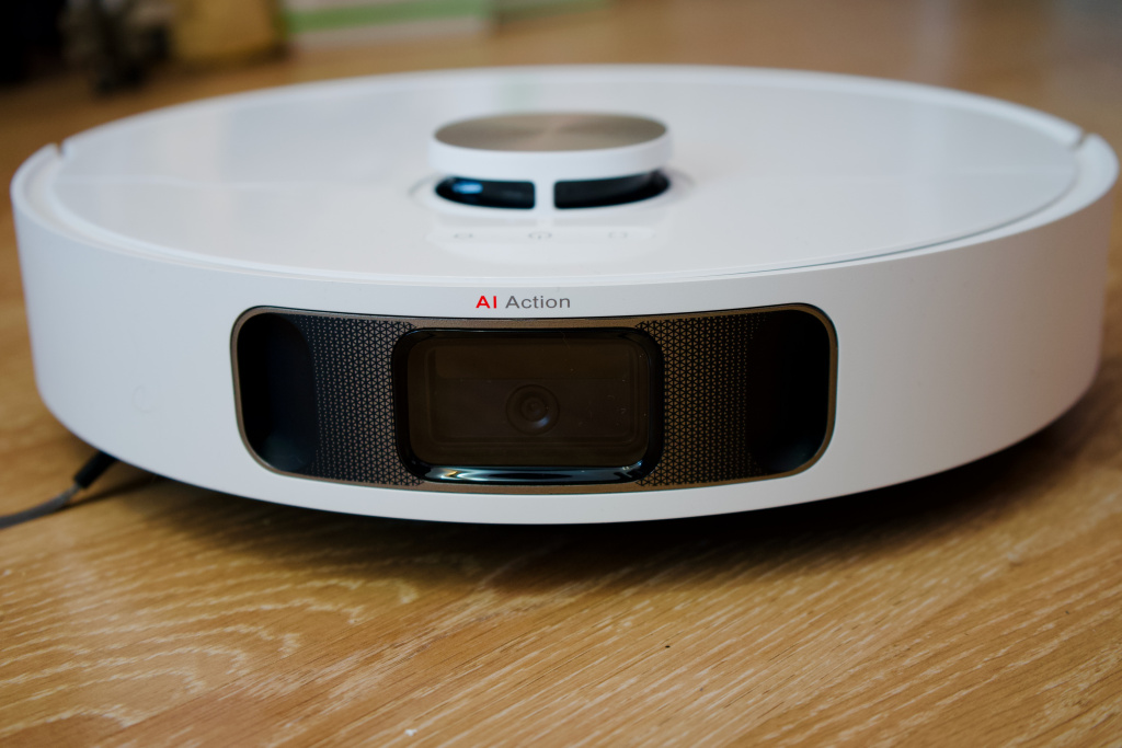 Спереди у робота-пылесоса расположилось окошко с камерой, а также отверстия динамиков по бокам от него. Устройство может использоваться в качестве средства для наблюдения за жильём. В моем случае можно пошпионить за котами, когда мы с женой решим куда-нибудь съездить.