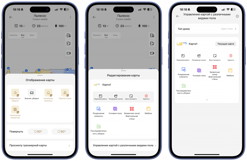 Приложение Dreame позволяет настраивать карту помещения. Есть возможность выбирать режим отображения, разделять комнаты, расставлять мебель, выбирать условия поверхности пола, изменять последовательность уборки, а также устанавливать запретные зоны и виртуальные границы.