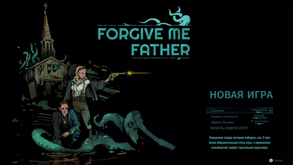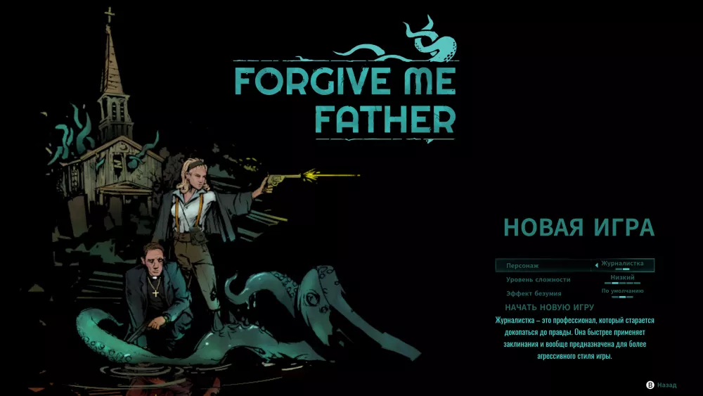 На старте к выбору Forgive Me Father даёт двух персонажей — священник и журналистка. В описании к первому говорится, что его игровой процесс предполагает оборонительный стиль. Мне такое не подходит, поэтому я выбрал журналистку. Игра за этого персонажа обещает быть агрессивной.