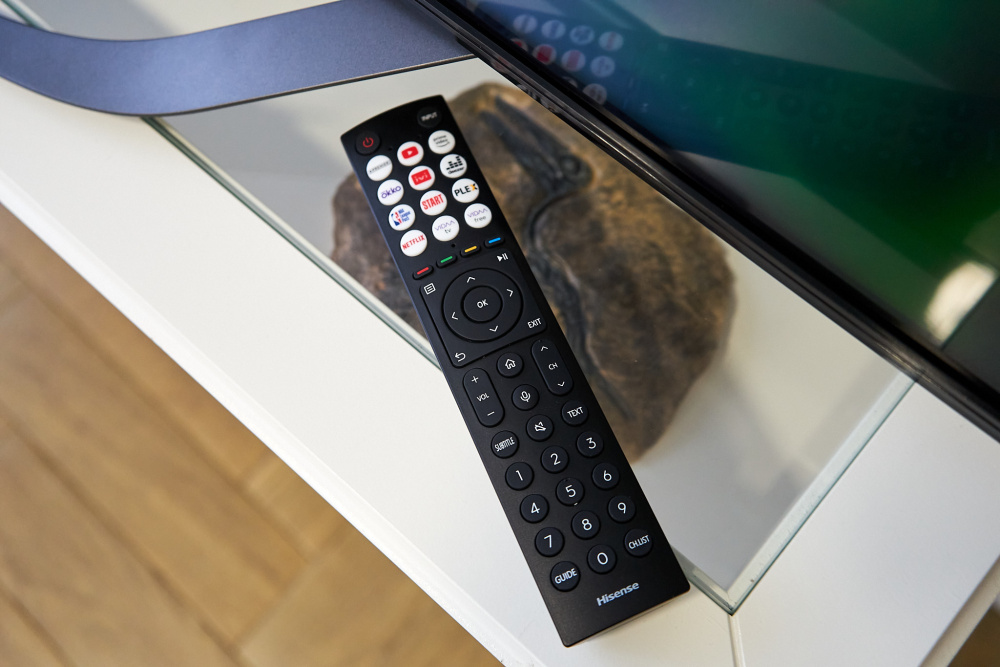 Для ПДУ в Hisense выбрали функциональный форм-фактор — это удобно для перехода к конкретному действию без необходимости вызова меню и навигации по различным разделам. К примеру, можно нажатием одной кнопки запустить YouTube или онлайн-кинотеатр START. Также стоит отметить наличие полноценного цифрового блока.