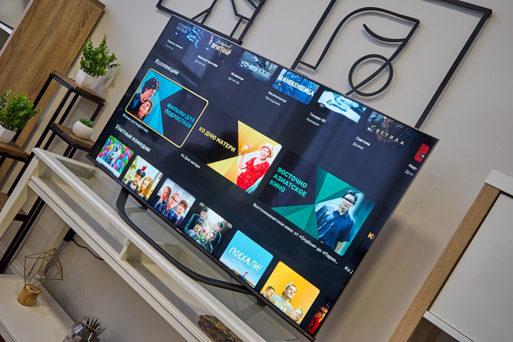Телевизор работает на фирменной операционной системе под названием VIDAA. У неё плавный и отзывчивый интерфейс — представляет собой ленту, которая разбита на сервисы с рекомендациями контента. В операционке «из коробки» предустановлены привычные онлайн-кинотеатры, среди которых «Кинопоиск», Premier, ivi и Okko.
