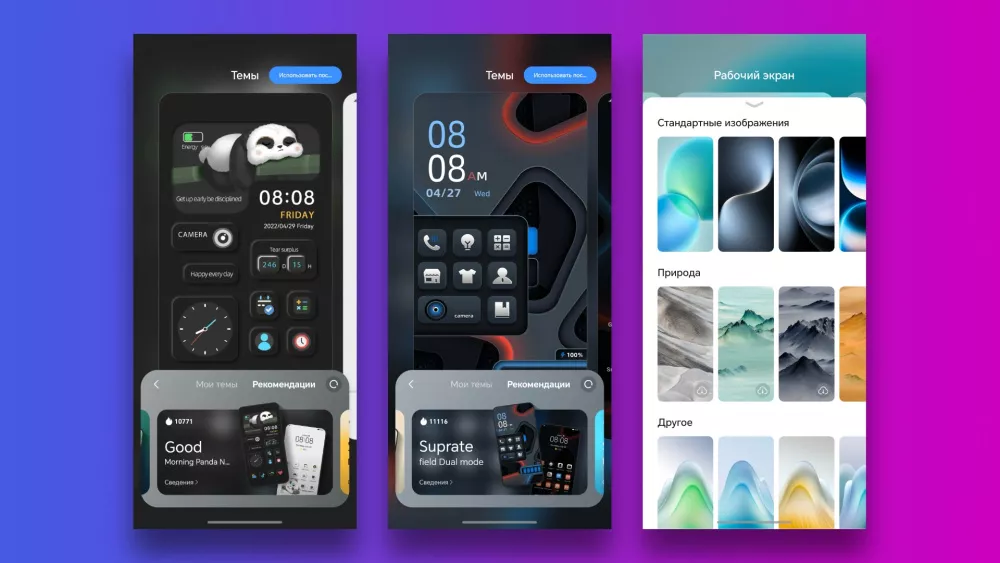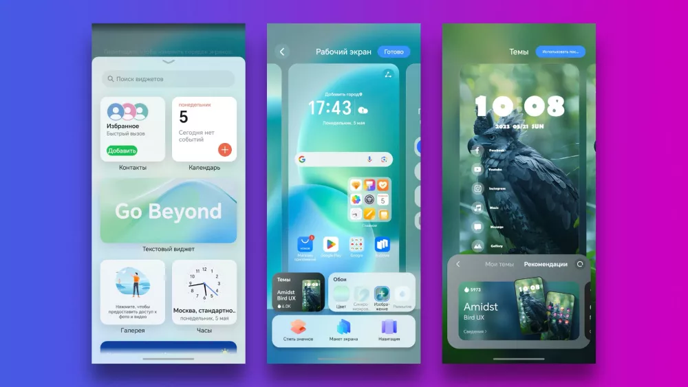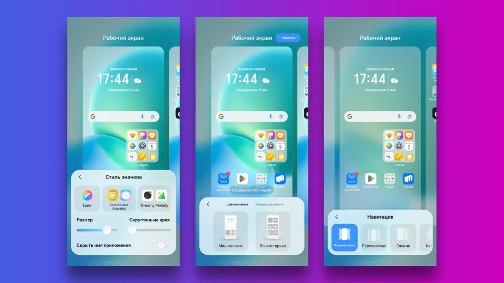Из коробки смартфон работает на Android 15 с оболочкой MagicOS 9.0. Интерфейс удобный и приятный по умолчанию, но при желании его можно настроить под себя штатными средствами. Для этого нужно сделать жест «щипка» на рабочем столе (свести два пальца) — откроется меню кастомизации — здесь доступен выбор тем, обоев, стиль значков, макет экрана и анимация навигации.