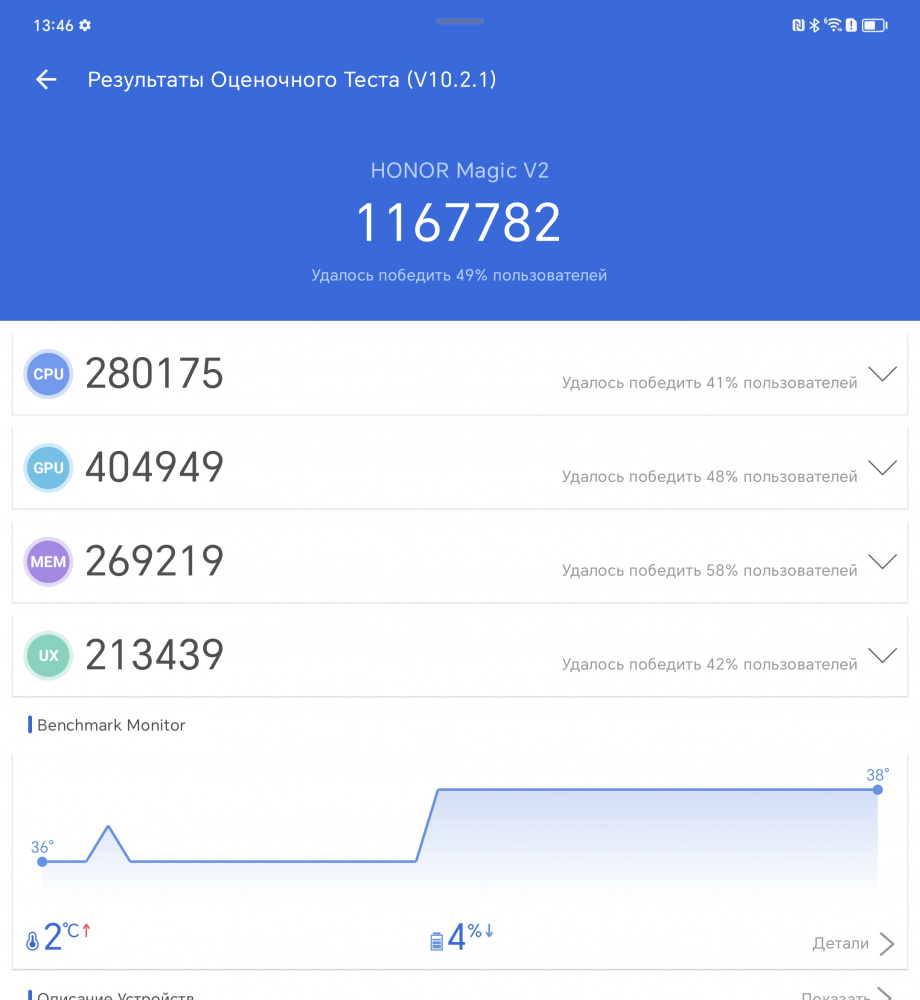 Из коробки HONOR Magic V2 работает на Android 13 с оболочкой MagicOS 7.2. Операционка шустрая, все приложения запускаются и переключаются быстро и без подлагиваний даже в многооконном режиме. Все актуальные игровые тайтлы загружаются и работают на максималках.