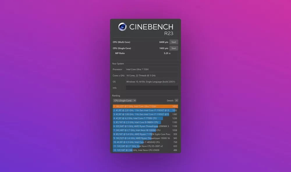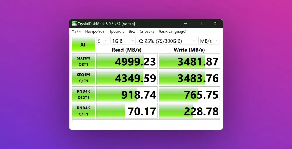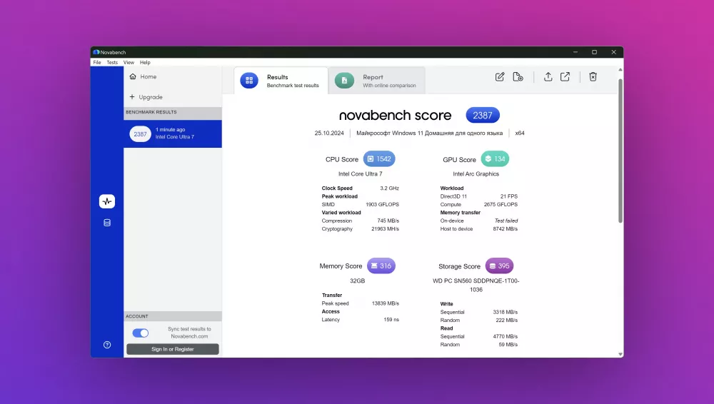 В качестве аппаратной платформы нашего тестового образца используется процессор Intel Core Ultra 7 155H, 32 ГБ оперативной памяти и накопитель на 1 ТБ. Мы протестировали ноутбук в Cinebench, CristalDiskMark и Novabench. Результаты тестирования вы сможете найти на скриншотах ниже: За охлаждение отвечает система Bionic VC. В ней используется испарительная камера из композитных материалов и карбида кремния, благодаря чему она не занимает много пространства внутри.В большинстве случаев система охлаждения работает довольно тихо. В обычном повседневном сценарии её и во все неслышно. О наличии вентиляторов вспоминаешь только на пиковых нагрузках.