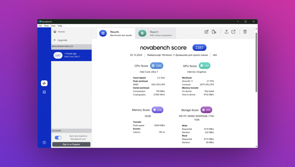В качестве аппаратной платформы нашего тестового образца используется процессор Intel Core Ultra 7 155H, 32 ГБ оперативной памяти и накопитель на 1 ТБ. Мы протестировали ноутбук в Cinebench, CristalDiskMark и Novabench. Результаты тестирования вы сможете найти на скриншотах ниже: