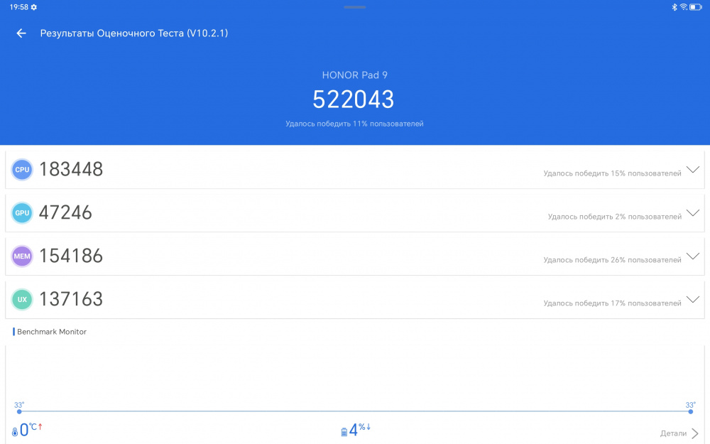 Протестировали планшет в AnTuTu, Geekbench и CPU Throttling Test. С результатами бенчмарков вы сможете ознакомиться на скриншотах ниже: Запаса производительности хватает на запуск хорошо оптимизированных игр с максимальными настройками, например, Call Of Duty. Чтобы поиграть в наиболее тяжелые тайтлы (Genshin Impact), придется снизить параметры графики на средний уровень.