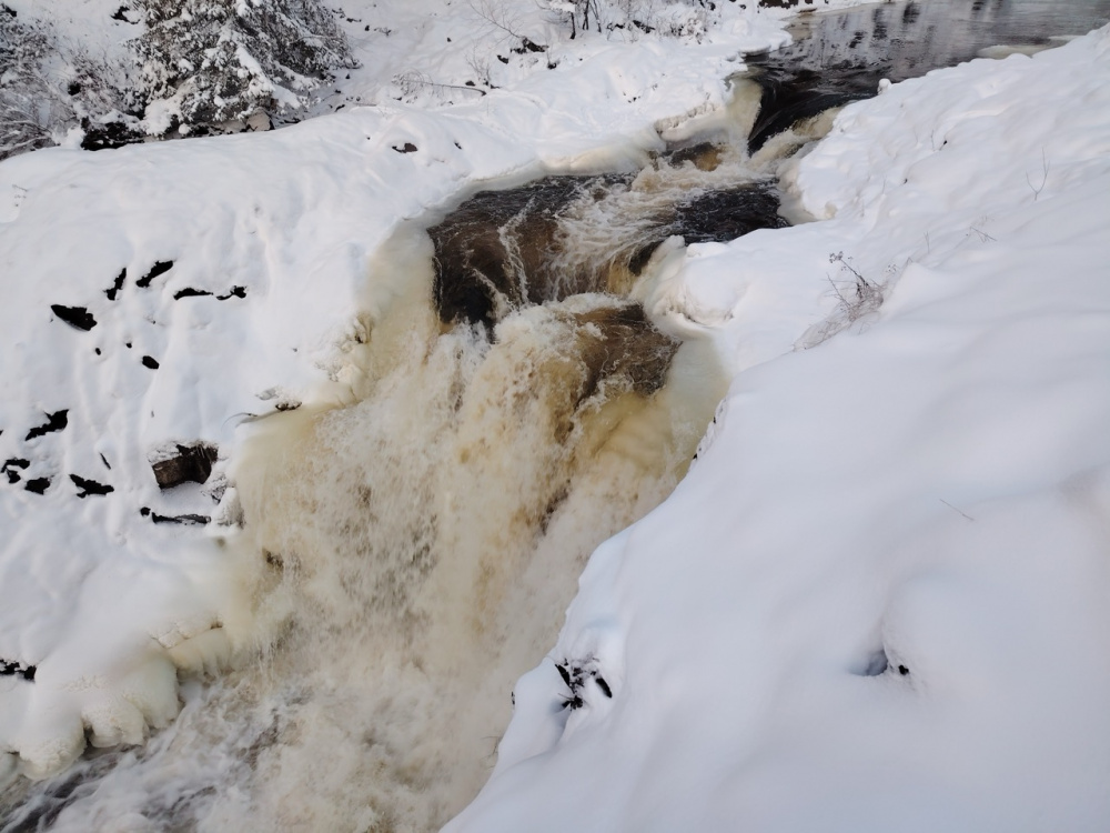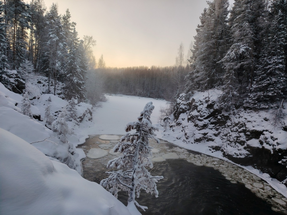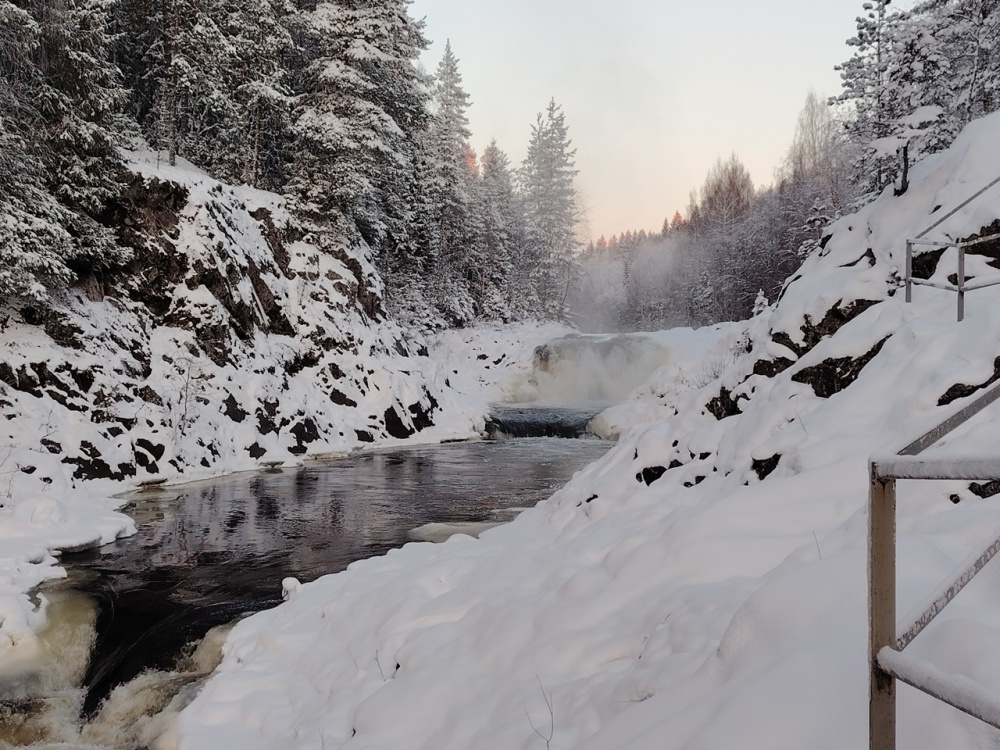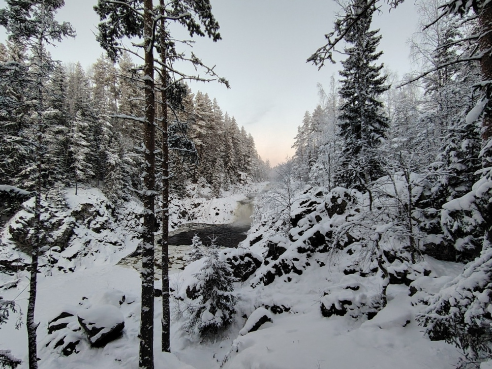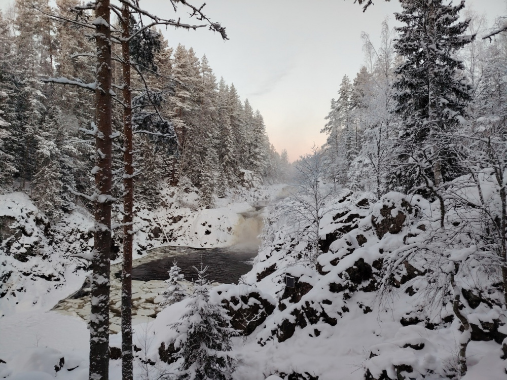 Путешествие по Карелии началась с посещения водопада Кивач, который окружает одноименный заповедник. Так сложилось, что это был самый холодный день поездки. С утра приложение погоды показало -22 градуса — отличный способ протестировать смартфон и съемку в мороз.