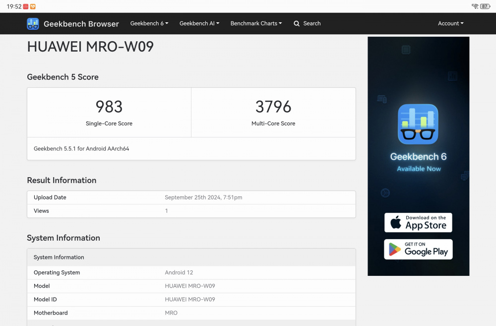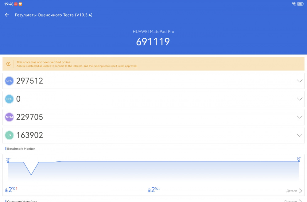 В качестве операционной системы используется HarmonyOS. Мы протестировали планшет в AnTuTu, Geekbench и CPU Throttling Test. С результатами бенчмарков вы сможете ознакомиться на скриншотах ниже: Обратите внимание на график CPU Throttling Test. Планшет хорошо справляется с пиковыми нагрузками и не сильно сбрасывает производительность.