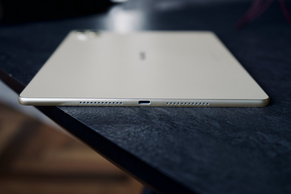 У нас на тесте планшет в цвете «роскошное золото». Смотрится свежо и необычно, даже несмотря на мои прохладные отношения к золотистым расцветкам. Впрочем, многое решает шелковистая текстура. Задняя панель изготавливается с использованием ультратонкого стекловолокна авиационного класса толщиной всего 0,5 мм. Она проходит длительный процесс полировки, что воссоздавать тактильный эффект шелка.