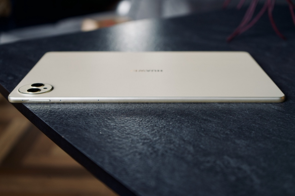 В углу на задней поверхности аккуратно разместилась двойная камера на круглой площадке — отсылка к серии смартфонов HUAWEI Mate. На верхнем торце расположены пара динамиков и клавиша блокировки экрана со сканером отпечатка пальцев. На правой грани размещены: качелька регулировки громкости и отверстия дополнительных микрофонов. На нижнем торце расположились еще пара динамиков и разъем USB-С.