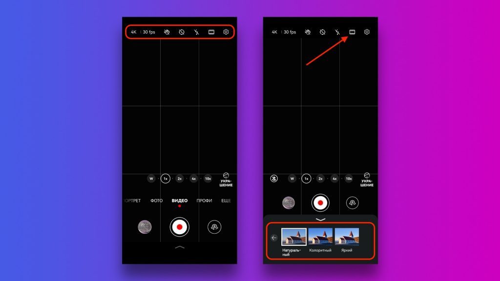 Если захочется поэкспериментировать с цветом на фото — в верхней части экрана есть кнопка предустановок XMAGE. Здесь доступны четыре пресета: Натуральный, Колоритный, Яркий и Моно (для ЧБ-фото).