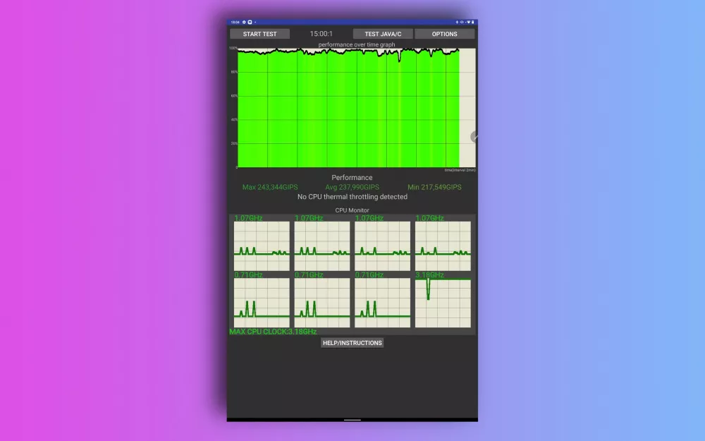 В бенчмарке AnTuTu планшет набрал 707988 баллов. Snapdragon 870 в отличие от модельного ряда 2022 года — стабильный, мощный и «холодный» чип. Обратите внимание на результаты теста CPU Throttling Test, он практически не сбрасывает пиковую производительность. К слову, за время тестирования устройство практически не нагрелось.