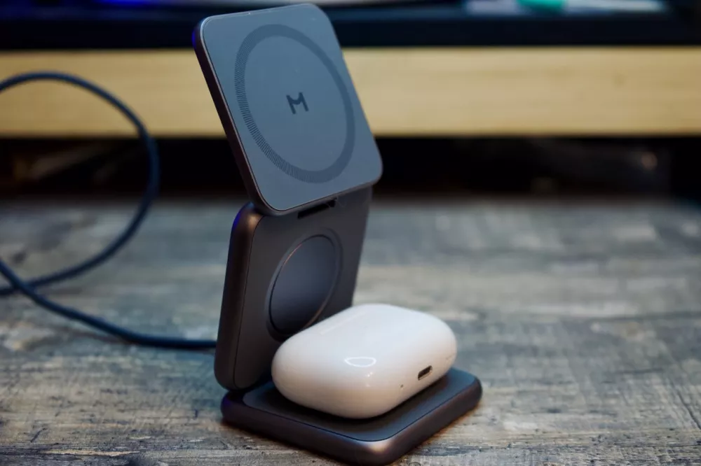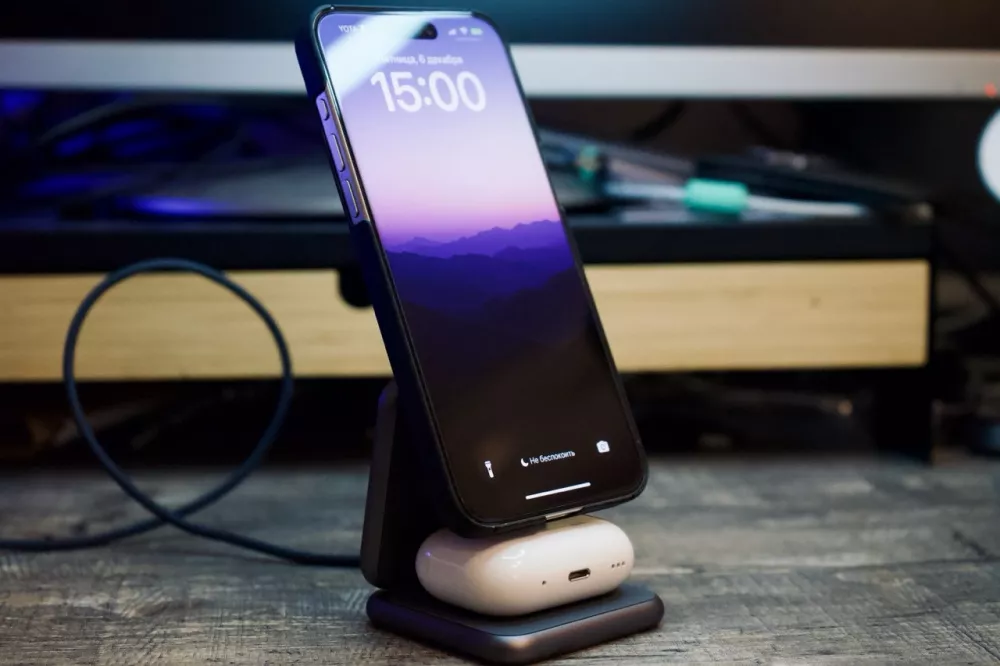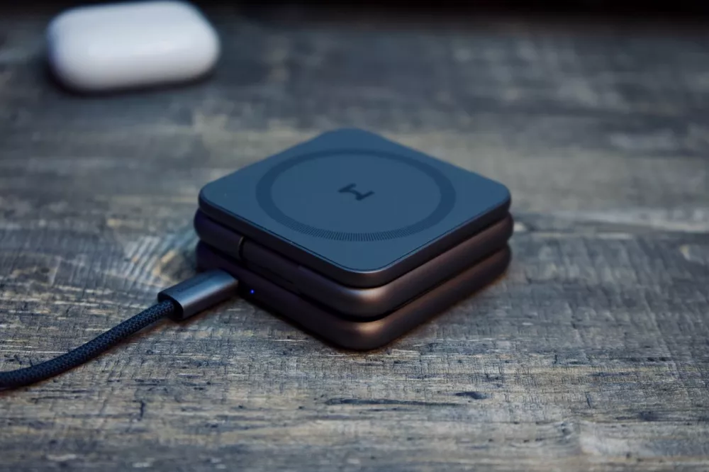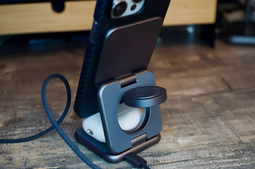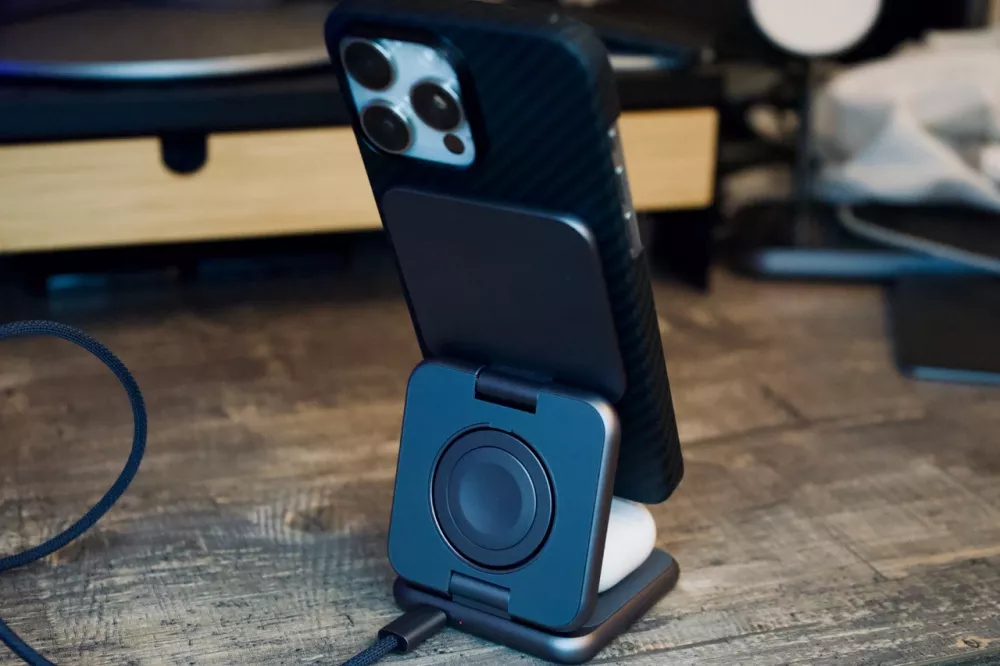 Зарядник очень стильный и компактный. Он способен одновременно заряжать iPhone (15 Вт), AirPods (5 Вт) и Apple Watch (2 Вт).Габариты зарядки позволяют брать её с собой в поездку, чтобы не таскать отдельный провода под каждый девайс. Конструкция позволяет регулировать угол наклона. Корпус выполнен из алюминиевого сплава. Поверхность для iPhone и AirPods выполнена из мягкого софт-тач материала. В комплекте идет кабель USB-С в текстильной оплётке. Среди поддерживаемых стандартов: Qi, Quick Charge и Power Delivery.