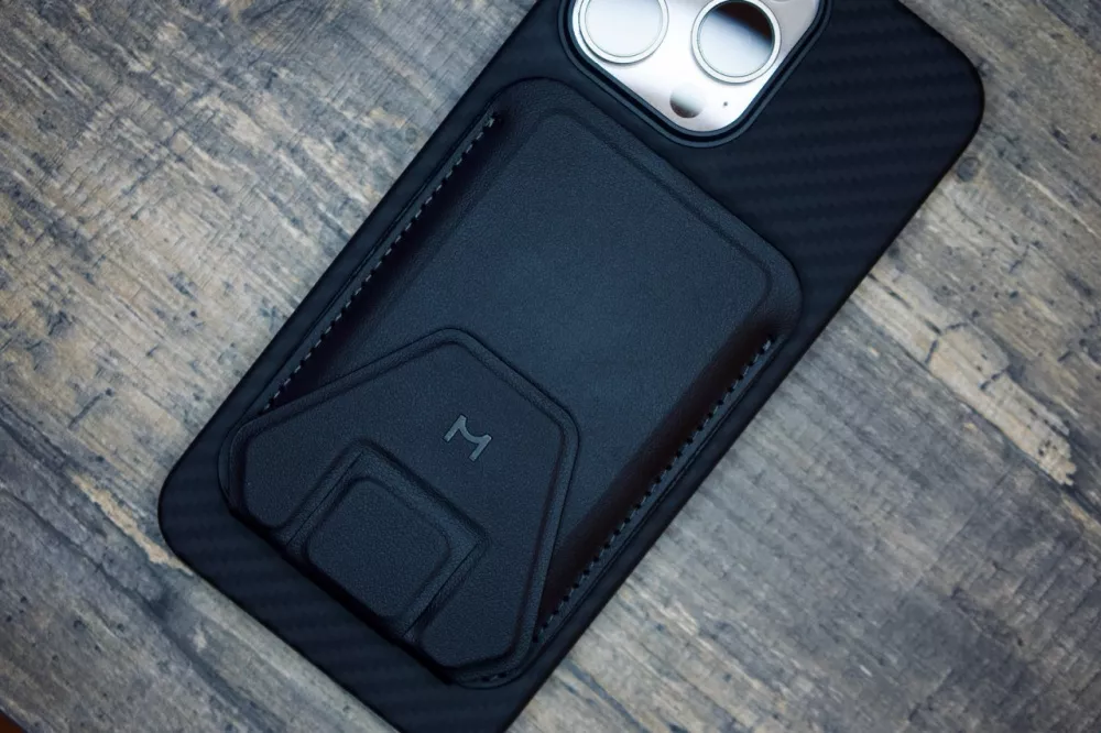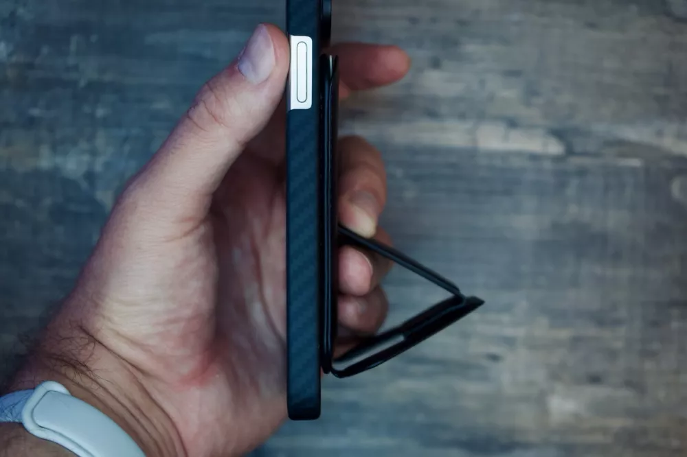 В этот кардхолдер с магнитом помещается до трех пластиковых карт. Самое интересное, что его можно использовать в качестве держателя для руки. Помимо этого аксессуар превращается в подставку для просмотра видео.