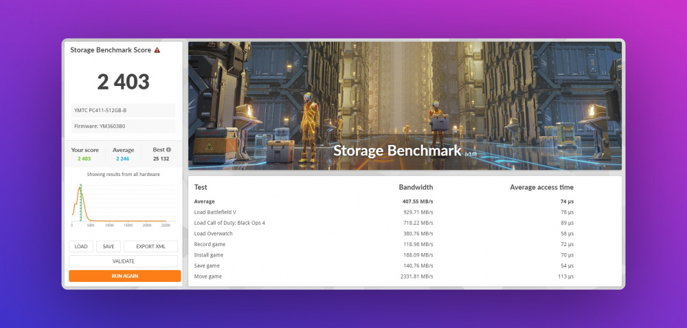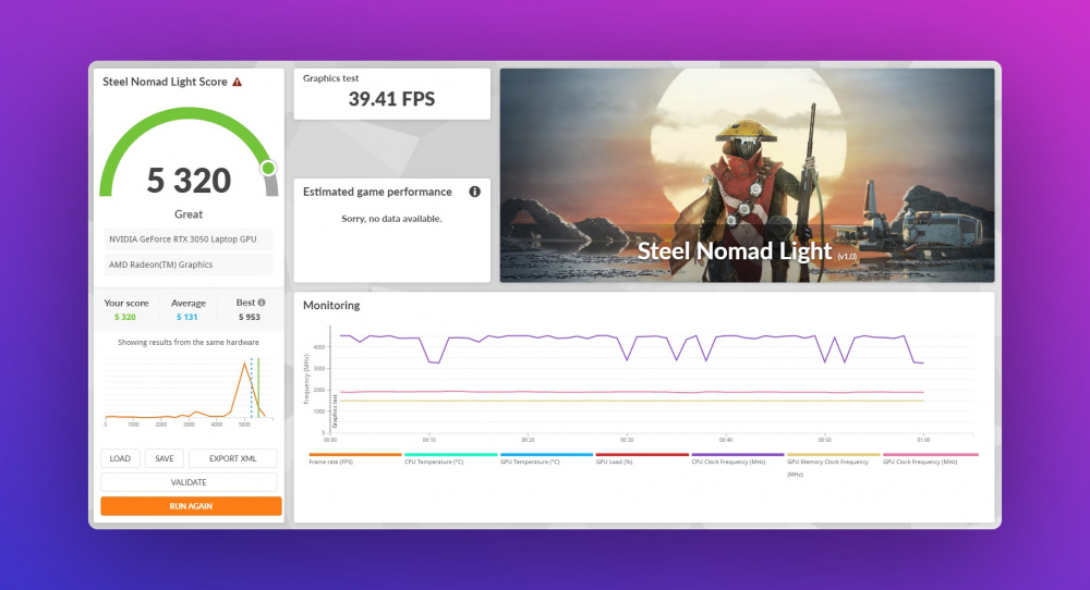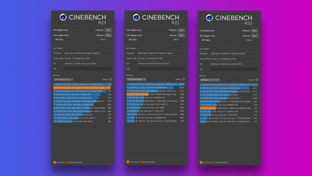 В качестве аппаратной платформы используется процессор AMD Ryzen 5 6600H (6 ядер/12 потоков, 3,3/4,5 ГГц, до 45 Вт). Наша тестовая конфигурация оснащена 16 ГБ оперативной памяти типа DDR5-4800 и накопителем на 512 ГБ (M.2 2280).Мы протестировали ноутбук в Cinebench, CrystalDiskMark и Geekbench. Скриншоты с результатами — ниже. Поскольку у нас в обзоре игровой ноутбук, ниже вы сможете ознакомиться с результатами тестов графики в 3DMark. Производительность — главная фишка ноутбука. Устройство показывает себя хорошо в повседневных задачах и в работе под нагрузкой.