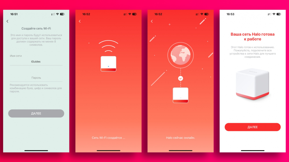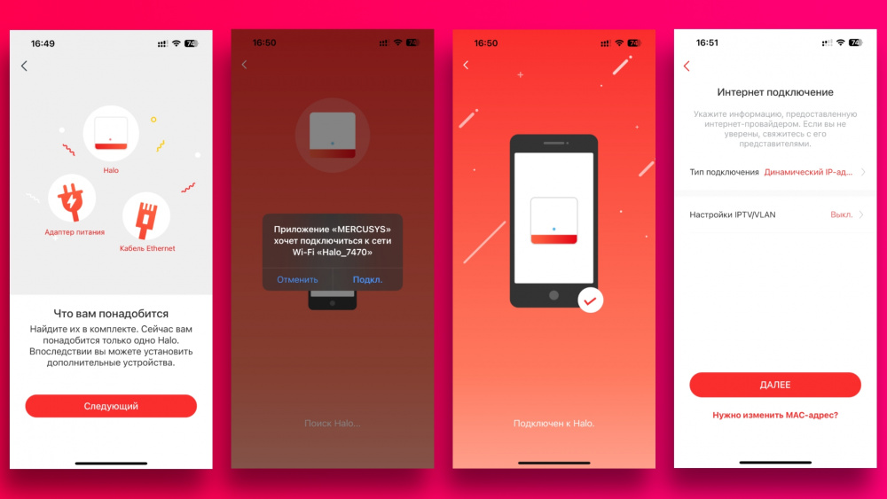 Процесс настройки выглядит следующим образом. Сначала включаем первый модуль системы Mercusys Halo H80X, подключаем питание и кабель вашего интернет-провайдера. Стоит отметить, что порты WAN/LAN в модулях Halo H80X с автоопределением, поэтому не нужно заморачиваться по поводу, куда и какой кабель подключать. Теперь нужно дождаться, когда индикатор состояния замигает синим цветом и переходить к следующему этапу. Сначала приложение предлагает создать временную сеть для подключения к модулю. Затем поэтапно выбираем тип подключения, задаем настройки Wi-Fi. По завершению начинаем подключать остальные модули. Для этого в приложении присваиваем им место размещения, например, гостиная. Если все шаги настройки пройдены правильно — у остальных модулей также замигает индикатор синим цветом и они начнут объединяться в единую сеть.