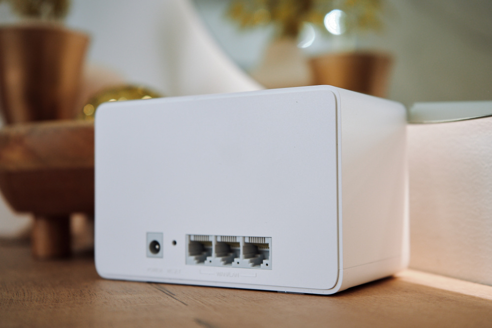 На фронтальной поверхности в нижнем левом углу размещен индикатор состояния, а в правом нанесён логотип бренда. На задней поверхности слева направо разместились разъем питания, утопленная в корпус кнопка сброса и три гигабитных порта WAN/LAN. На верхней рамке имеются фигурные отверстия для отвода теплого воздуха. Мне нравится эстетика минимализма в бытовых приборах — только всё самое необходимое и ничего лишнего.