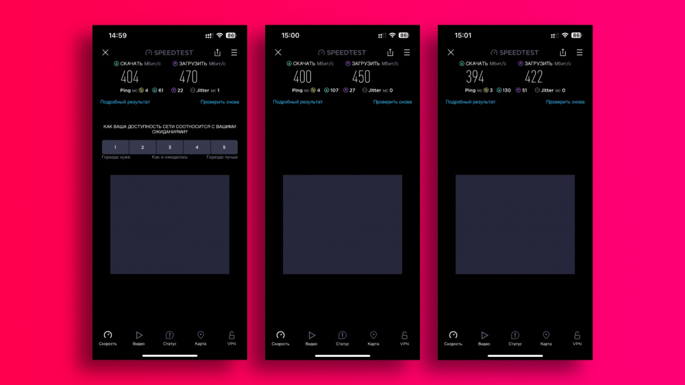 - Первый замер на кухне (скорость скачивания/выгрузки): 404/470 Мбит/с