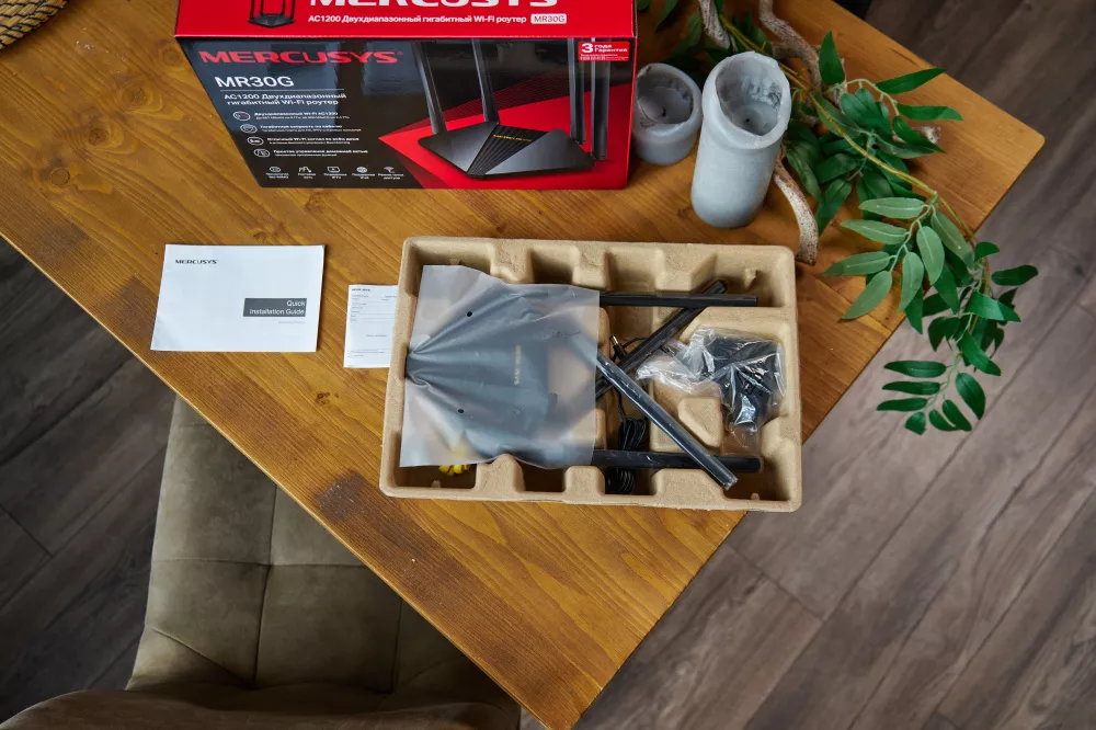 Mercusys MR30G поставляется в коробке с дизайном в фирменных цветах бренда: красном и черном. Внутри вы найдете: роутер, адаптер питания, патч-корд и техническую документацию.
