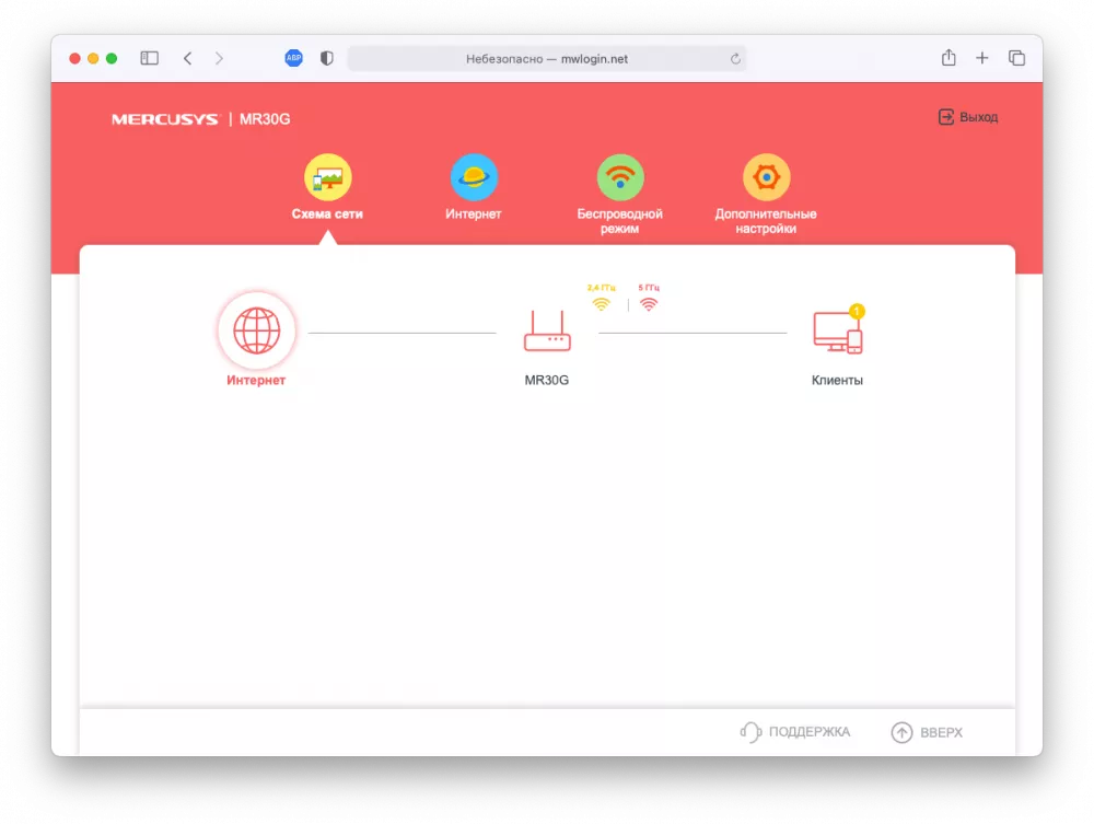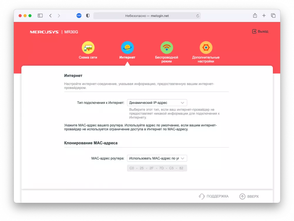 После быстрой настройки и подключения веб-интерфейс Mercusys MR30G выглядит так. В правом нижнем углу имеется кнопка для связи со службой поддержки на случай, если возникнут дополнительные вопросы. В верхней части представлены четыре основных раздела: «Схема сети», «Интернет», «Беспроводной режим» и «Дополнительные настройки». Первая вкладка отображает состояние подключения к интернету, во второй размещены основные настройки интернет соединения, среди которых тип подключения и MAC-адрес роутера. В разделе «Беспроводной режим» собраны установки Wi-Fi сетей.