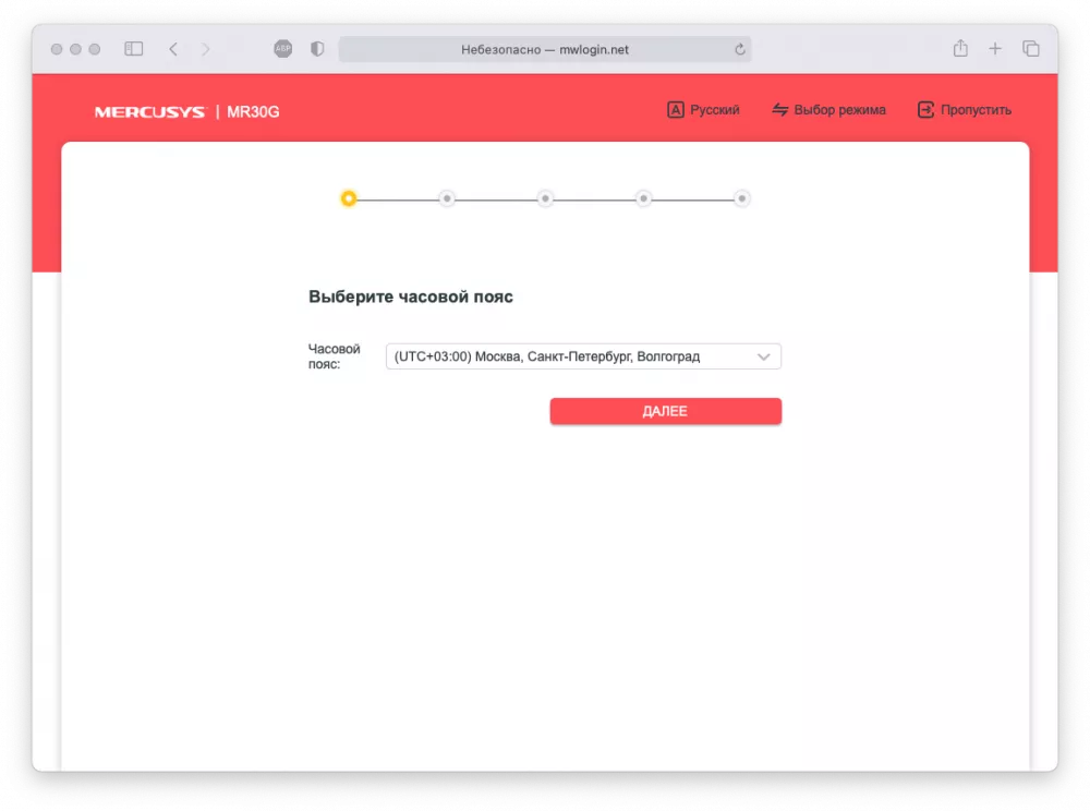 На финальном этапе веб-интерфейс Mercusys MR30G предлагает проверить и подтвердить сетевые настройки. Если всё верно, нажимаем кнопку «Далее». Вот так буквально в четыре клика мы настроили роутер.