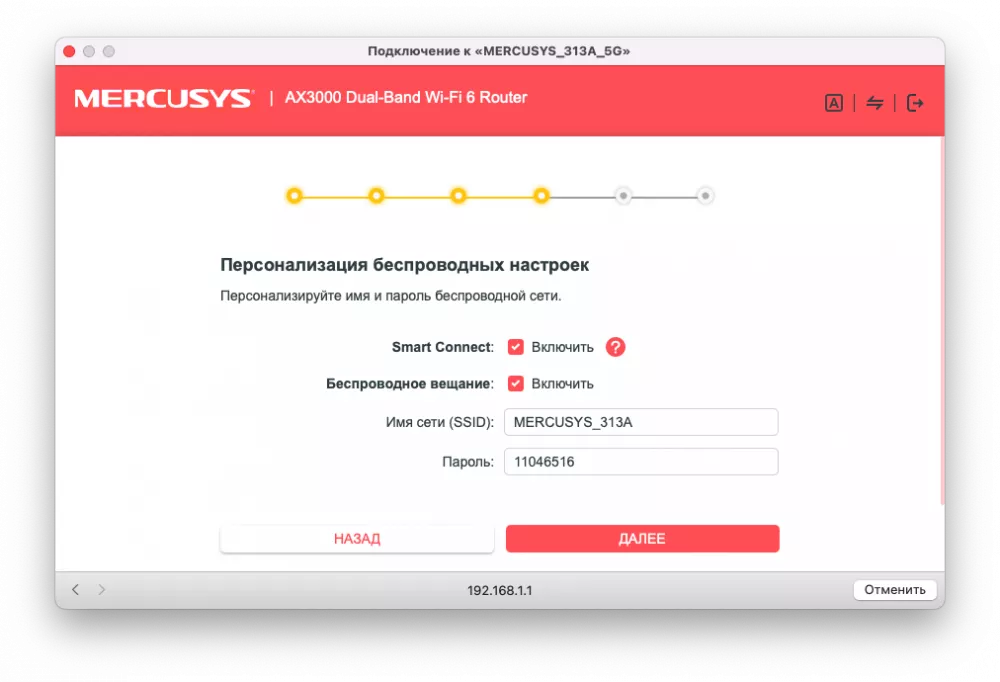 Сначала роутер попросит создать пароль администратора. Здесь нужно использовать из цифр и букв разного регистра. Мы же хотим надежную Wi-Fi сеть? Следом устанавливаем свой часовой пояс. Непосредственно перед финальным этапом Mercusys MR80X предложит персонализировать Wi-Fi сеть. На этой стадии можно ввести своё наименование, задать новый пароль, а также активировать функцию Smart Connect. После ввода этих данных не забудьте активировать автоматические обновления.