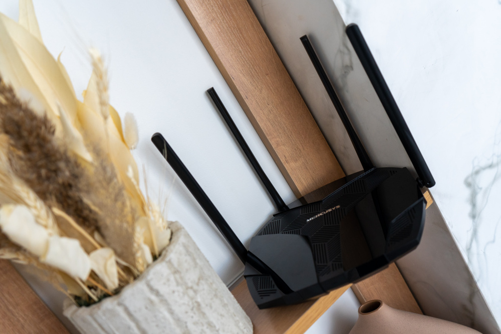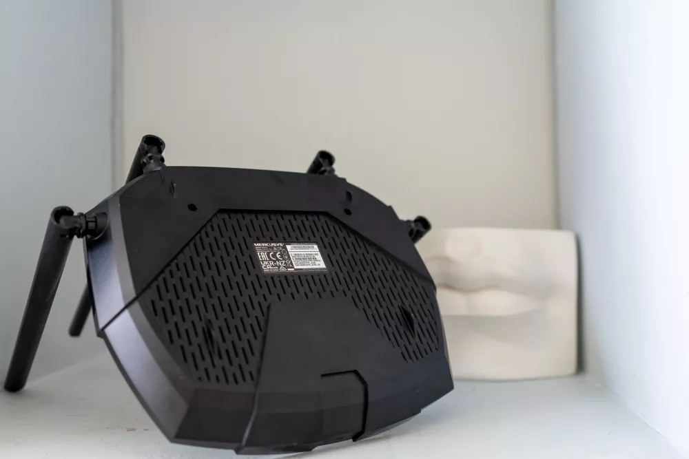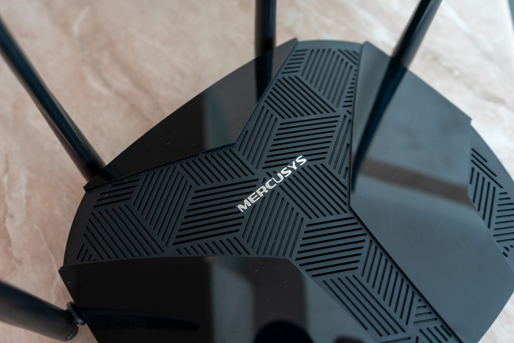 Корпус Mercusys MR80X выполнен в привычном черном цвете. Сверху нанесен логотип бренда. Глянцевую поверхность производитель разнообразил текстурированными вставками. Снизу имеется четыре ножки.