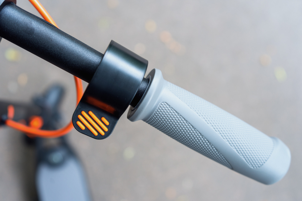 Силуэт электросамоката будет хорошо знаком пользователям, которые уже катались на двухколесном транспорте с электрической тягой в сервисах кикшеринга вроде того же Яндекса, Whoosh или Urent. На рулевой перекладине слева направо расположены рукоятка тормоза, звонок, фиксатор руля для транспортировки в сложенном состоянии и кнопка движения. По центру под рулём размещается дисплей бортового компьютера с многофункциональной клавишей.