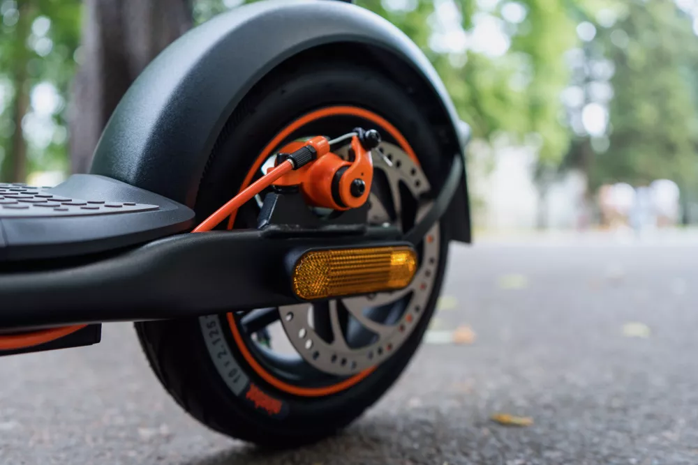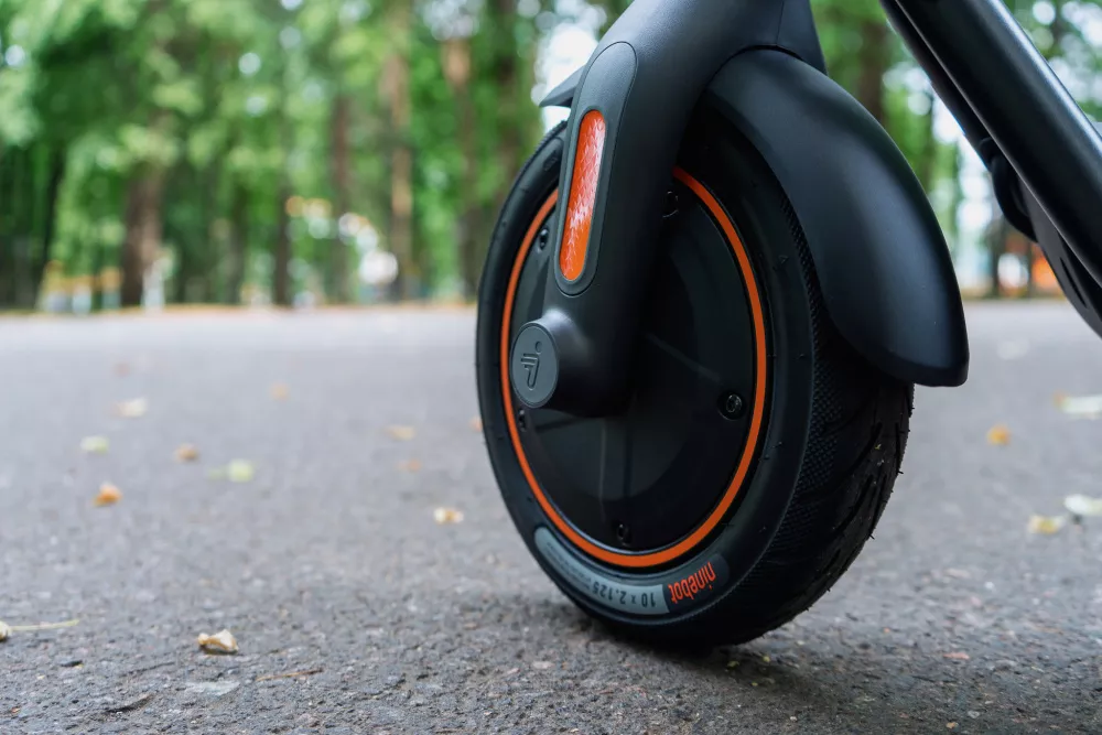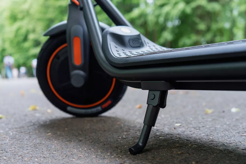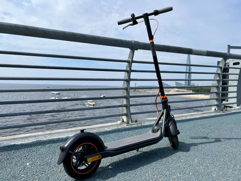 Спереди на рулевой стойке Ninebot KickScooter F40A есть подсветка. Пневматические 10-дюймовые шины тактильно довольно прочные и упругие. Площадка для ног оптимальна по размеру в моём случае — мне с моим 45-м размером вполне комфортно. Самокат защищен по стандарту IPX5 — поездки под сильным дождем не рекомендуются. Корпус окрашен в оттенках серого цвета с яркими оранжевыми деталями. На заднем крыле есть фонарь-габарит, а на вилке — два отражателя. В целом конструкция Ninebot KickScooter F40A ощущается добротной и надежной, всё на своих местах, ничего не скрипит и не люфтит.