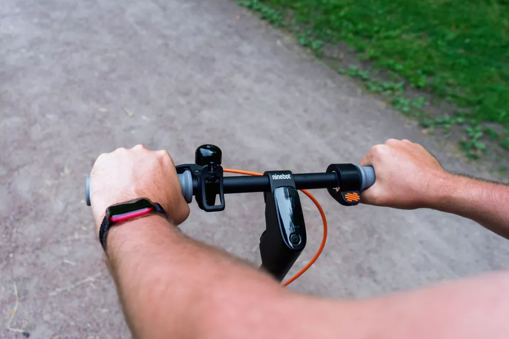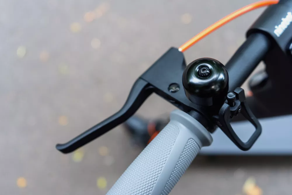 Силуэт электросамоката будет хорошо знаком пользователям, которые уже катались на двухколесном транспорте с электрической тягой в сервисах кикшеринга вроде того же Яндекса, Whoosh или Urent. На рулевой перекладине слева направо расположены рукоятка тормоза, звонок, фиксатор руля для транспортировки в сложенном состоянии и кнопка движения. По центру под рулём размещается дисплей бортового компьютера с многофункциональной клавишей.