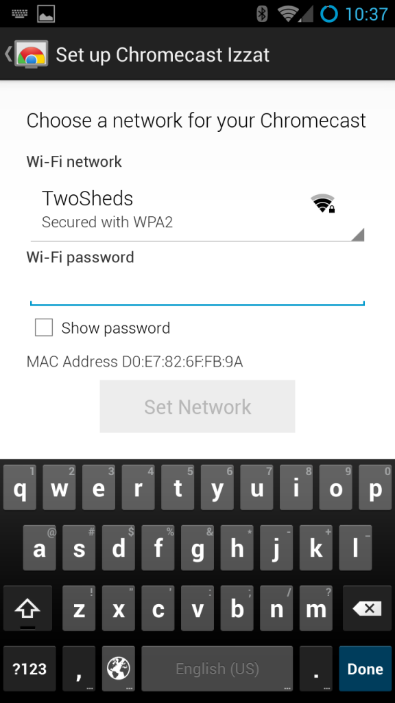 Если WiFi у вас защищен паролем (если не защищен, запарольте сейчас же), вас попросят этот пароль ввести. Это для Chromecast. Другие параметры сети (название, тип защиты) вводить не надо - приложение все узнает от телефона и само настроит все на Chromecast.