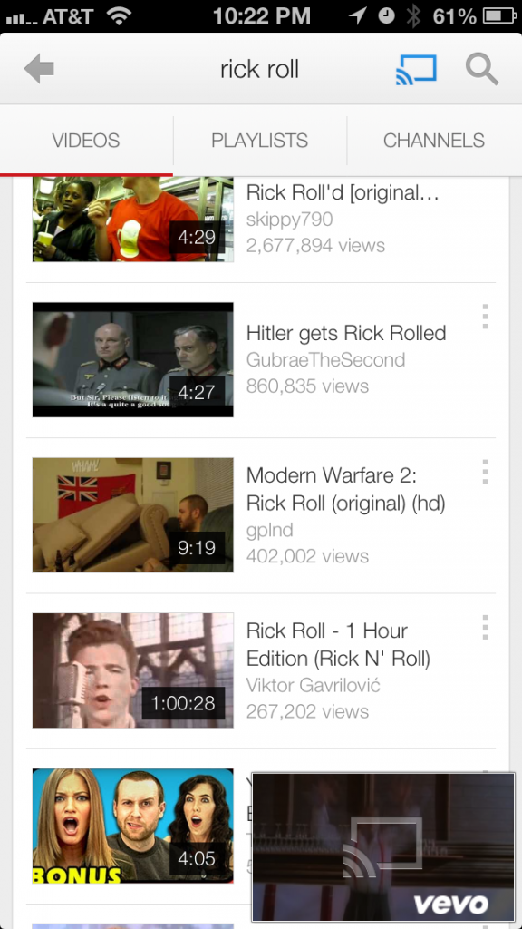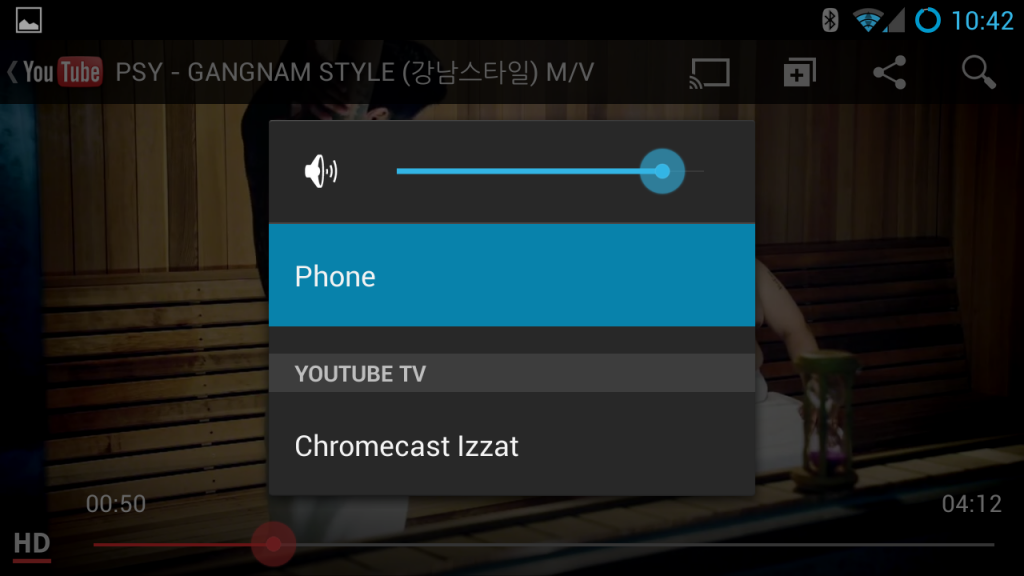 Держать приложение YouTube запущенным на телефоне совсем необязательно - ролик стримится прямо на Chromecast. Так что можно поиграть в игру, можно почитать почту - все, что вы обычно делаете на телефоне. Можно даже просто телефон выключить. Ролик будет продолжать играть.