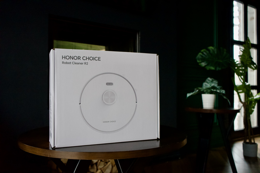 HONOR CHOICE Robot Cleaner R2 поставляется в коробке белого цвета. В комплект, помимо робота, входят все необходимые аксессуары для уборки: зарядная док-станция, адаптер питания, съемная платформа с салфеткой для влажной уборки и документация. Вспомогательная и основная щетки уже вставлены в пылесос.