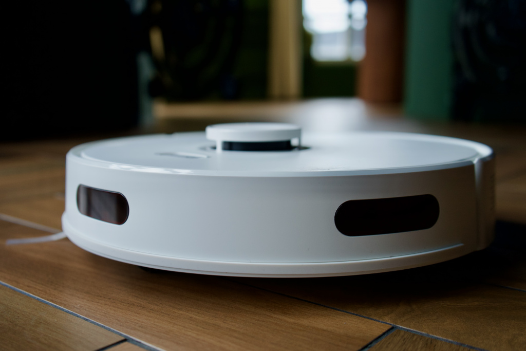 Спереди у пылесоса расположены три окошка дополнительных датчиков — они помогают лидару строить наиболее точную карту помещения и избегать препятствий.