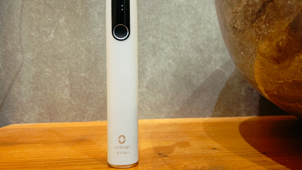 Oclean X Pro Elite выполнена в минималистичном дизайне без каких-либо лишних элементов. За счет цилиндрической формы она удобно лежит в руке, а кнопка включения располагается прямо под большим пальцем. Чуть выше над клавишей размещен OLED-дисплей с сенсорной панелью, переключение функций осуществляется с помощью свайпов. Эти элементы оформлены в единый блок.