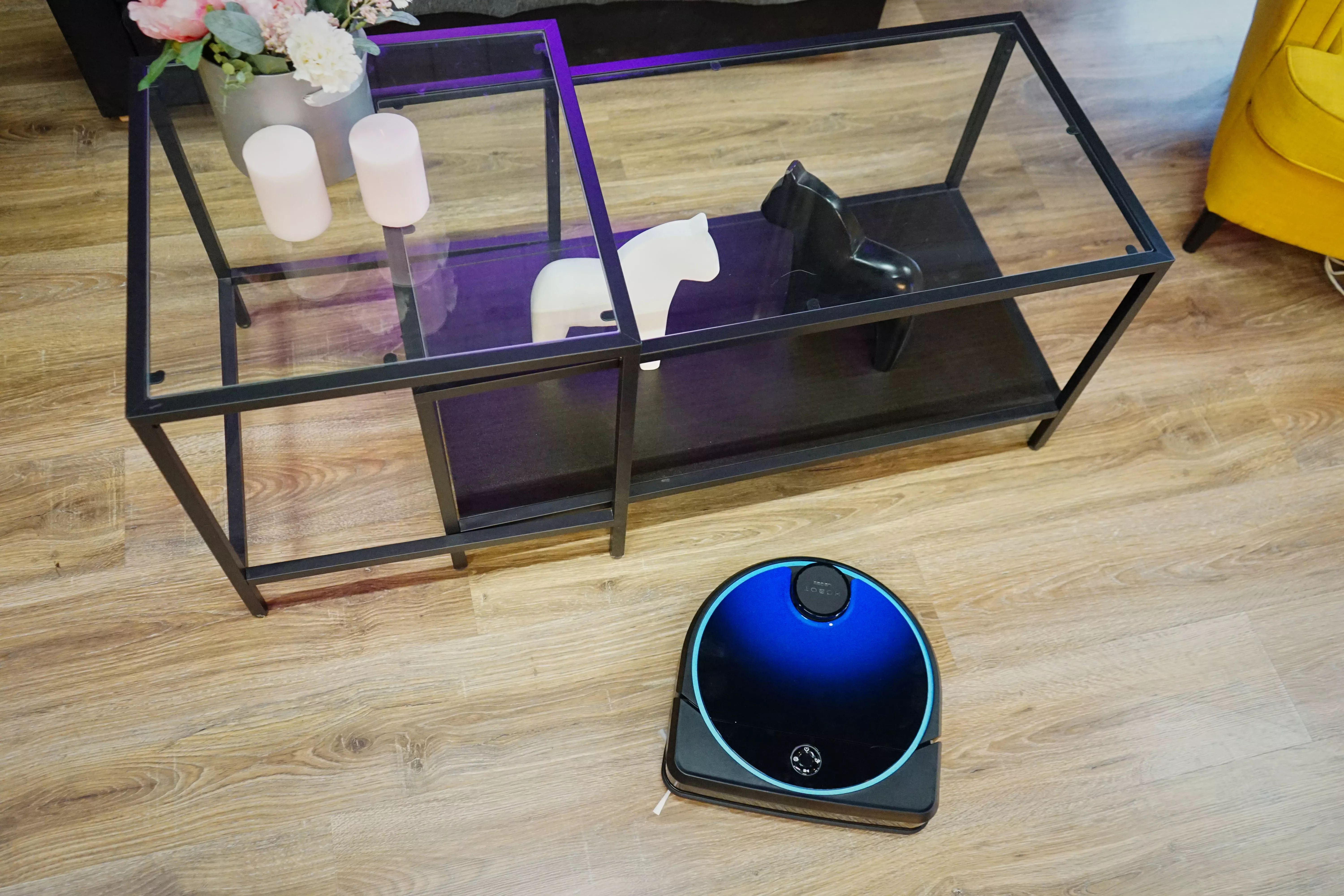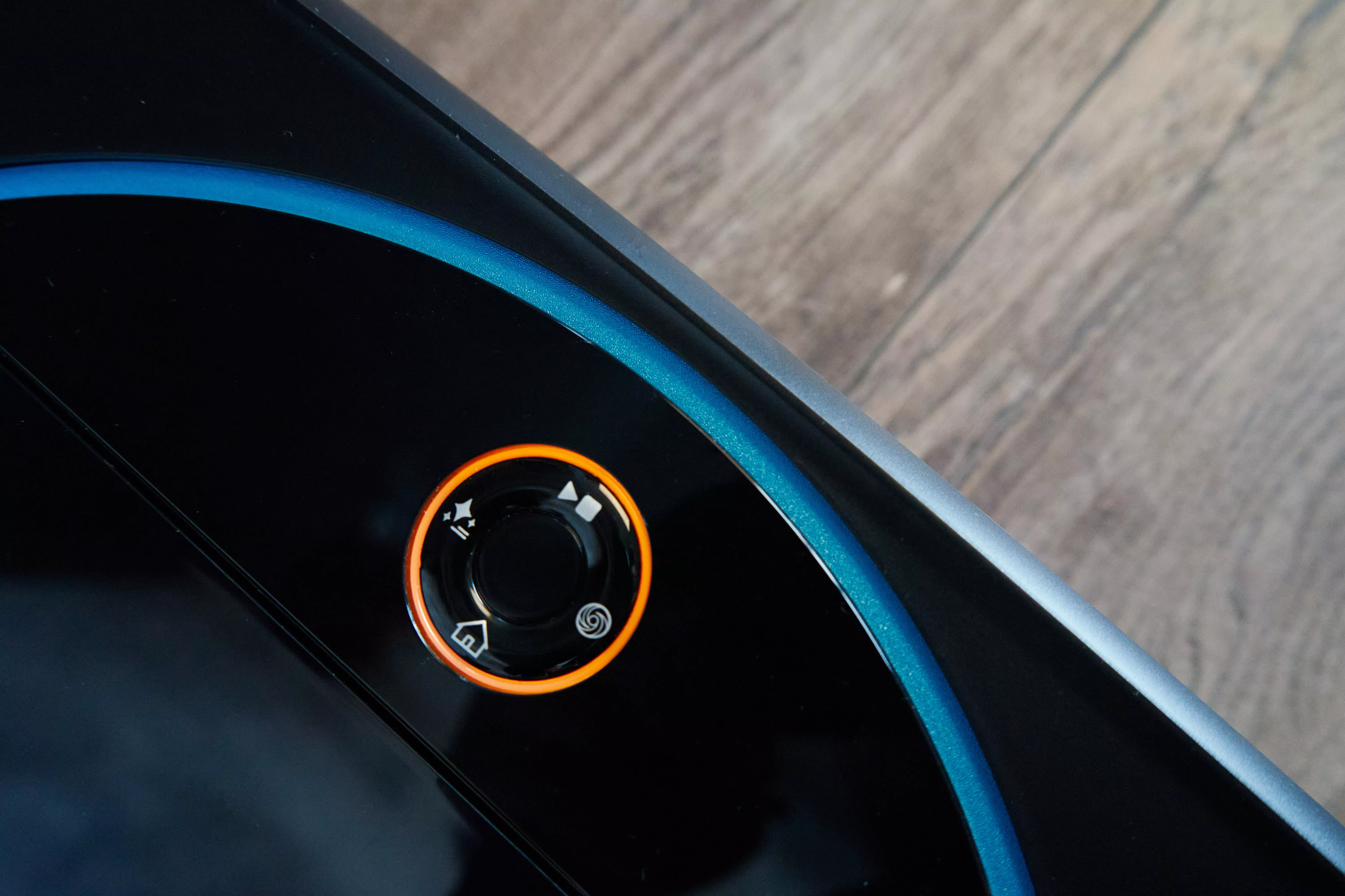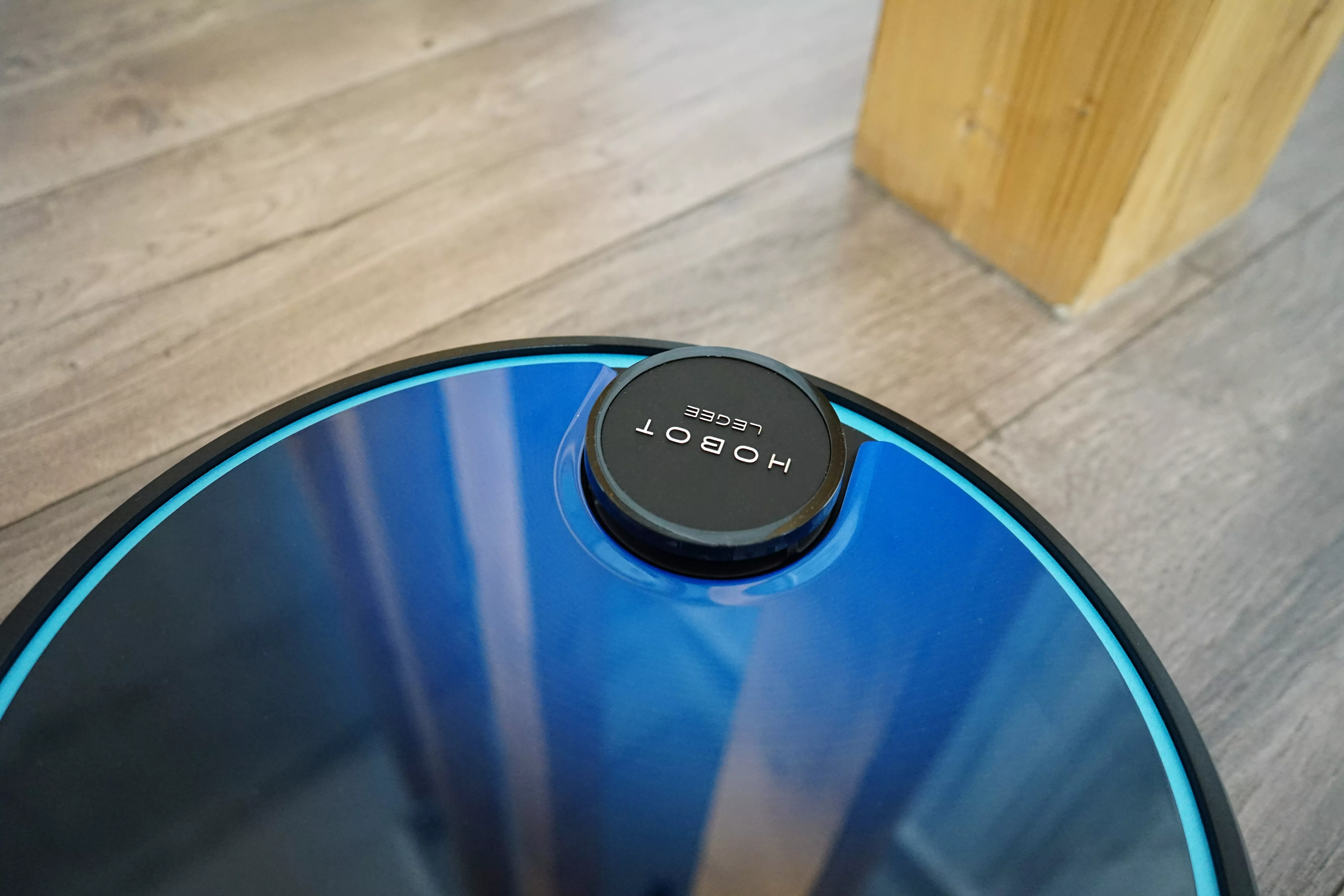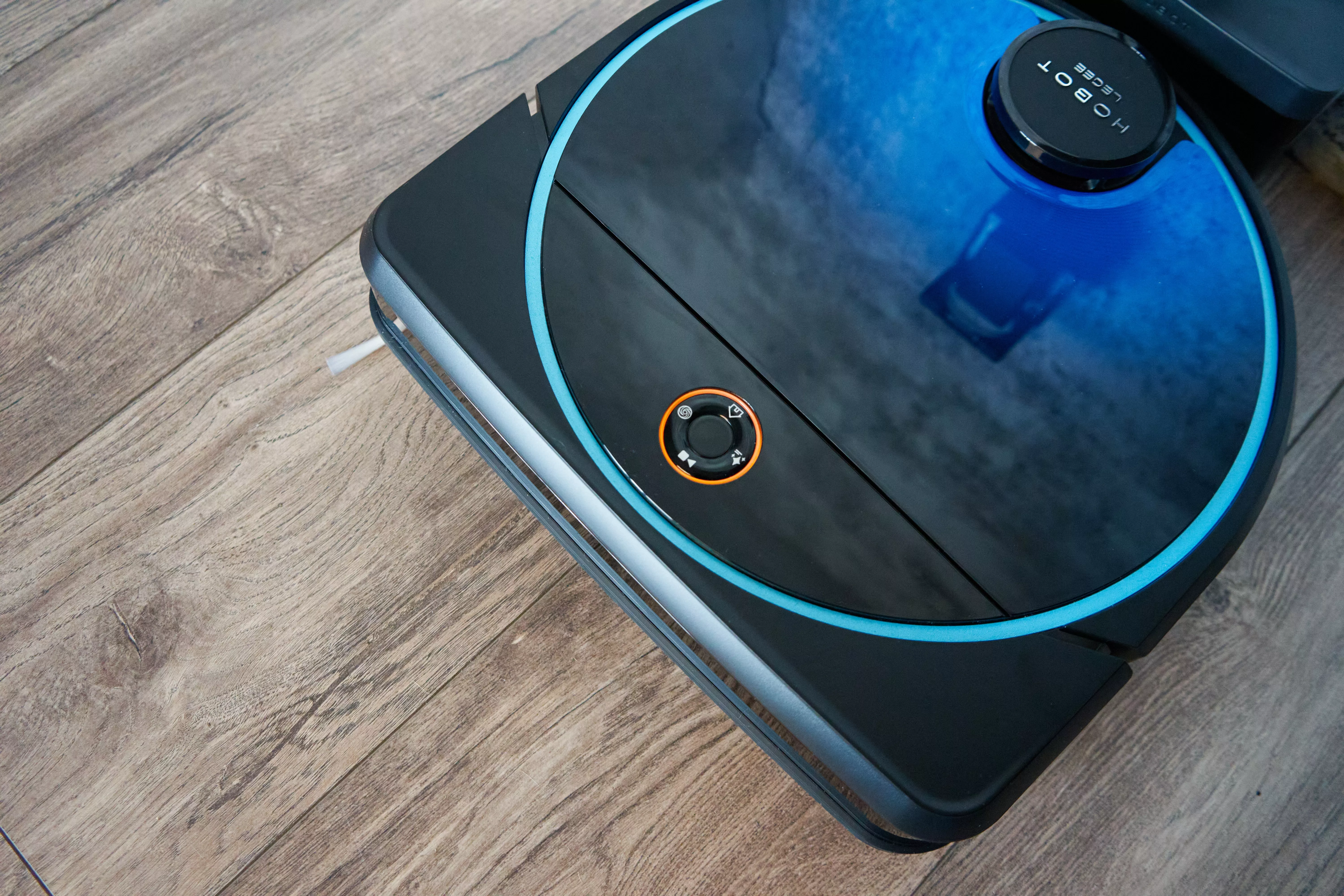 Сверху добавлена панель управления с четырьмя кнопками: старт / пауза, принудительное возвращение на базу, мощный режим и режим полировки пола. Это альтернативный режим управления роботом помимо мобильного приложения. В панель интегрирована подсветка — когда робот включен, область вокруг кнопок загорается. Высота корпуса составляет 99 мм, стандартное значение для робота-пылесоса. Он без проблем проникает в слепые зоны, вроде дивана или шкафа с короткими ножками.