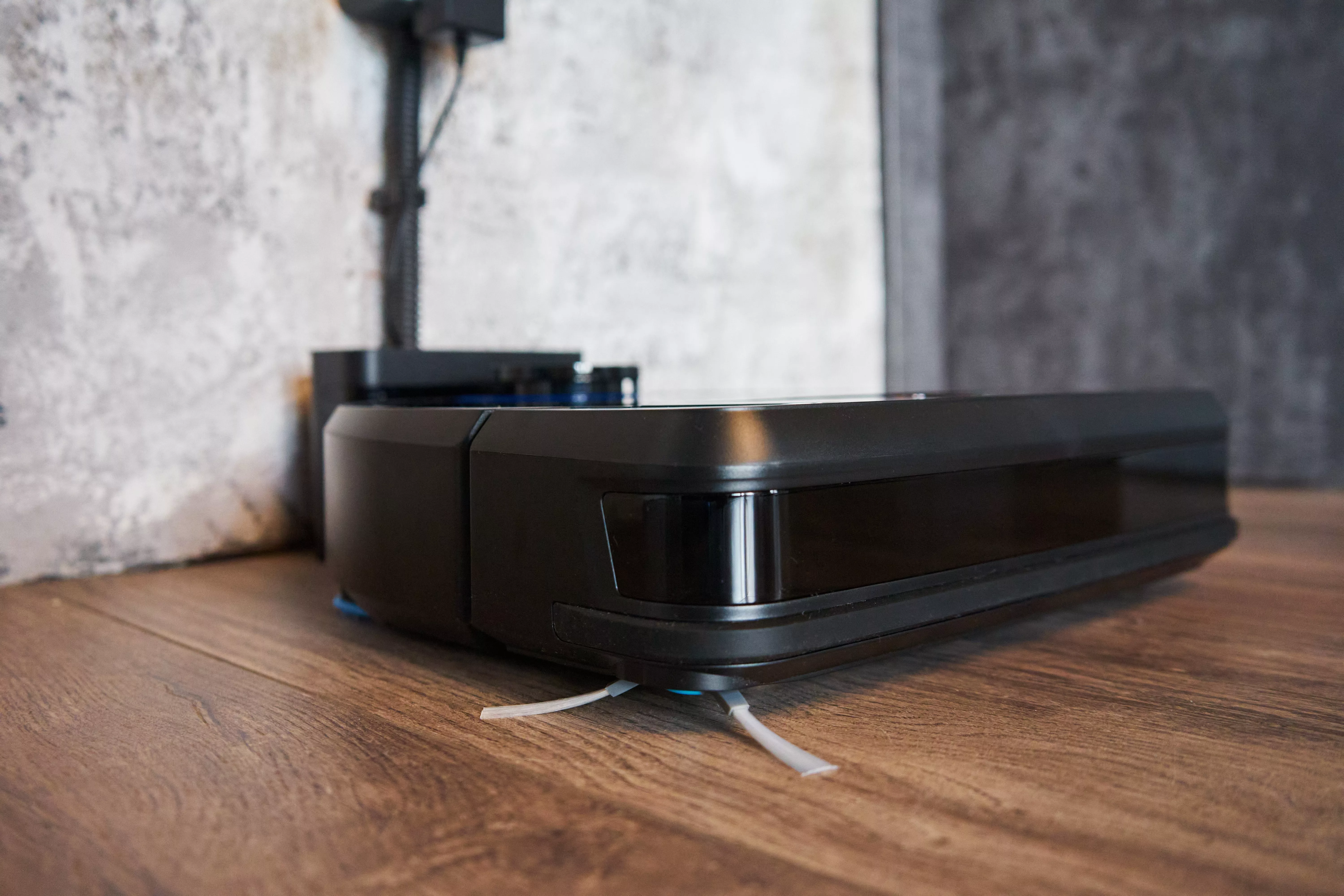 Под корпусом располагается одна боковая щетка, четыре датчика защиты от падения, всасывающее отверстие и четыре форсунки для смачивания пола. На нижнюю часть корпуса крепятся две салфетки.