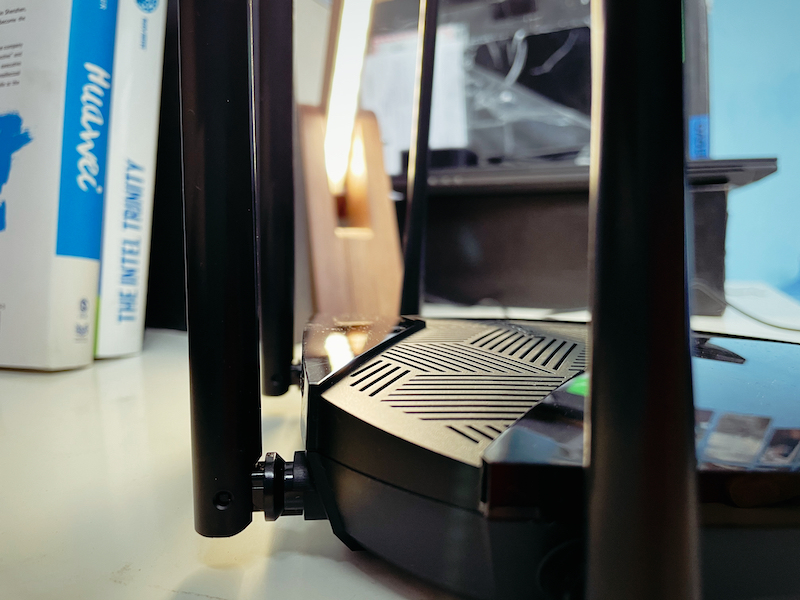 На нем расположены четыре внешние антенны с высоким коэффициентом усиления вкупе с новейшими технологиями. Они обеспечивают отличный сигнал во всем доме. Добавлена технология Beamforming. Она обнаруживает подключенные устройства и концентрирует сигнал Wi‑Fi в их направлении, так стабильность подключения увеличивается.