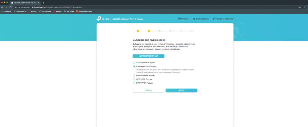 Открываем в браузере страничку http://tplinkwifi.net или http://192.168.0.1 — откроется веб-интерфейс с настройками роутера. Во время первого запуска вас попросят придумать пароль. Используйте сложную комбинацию. Далее стартует функция поэтапной настройки. Она по умолчанию на английском языке, но в правом верхнем углу есть переключатель, где можно выбрать русский.