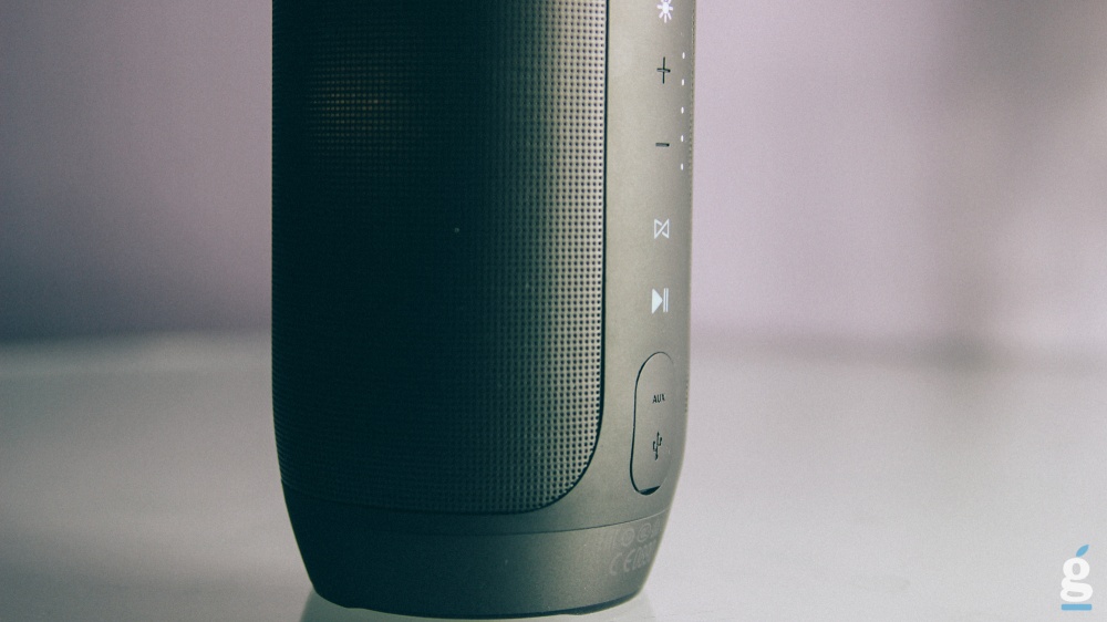 На первый взгляд JBL Pulse 2 выглядит как многие другие беспроводные акустические системы — ничего необычного. Металлическая решетка, пластиковая вставка с кнопками и прорезиненные основания. На панели управления находится питание, включение Bluetooth, регулировка громкости, управлять воспроизведением и входящими вызовами. Pulse 2 можно использовать как спикером, причем с системой шумоподавления. А в самом низу находится резиновая заглушка, под которой скрывается порт microUSB для зарядки и AUX для проводного подключения источника звука. Внутри установлен аккумулятор емкостью 6000 мАч, заряда хватит примерно на 8-10 часов воспроизведения музыки.