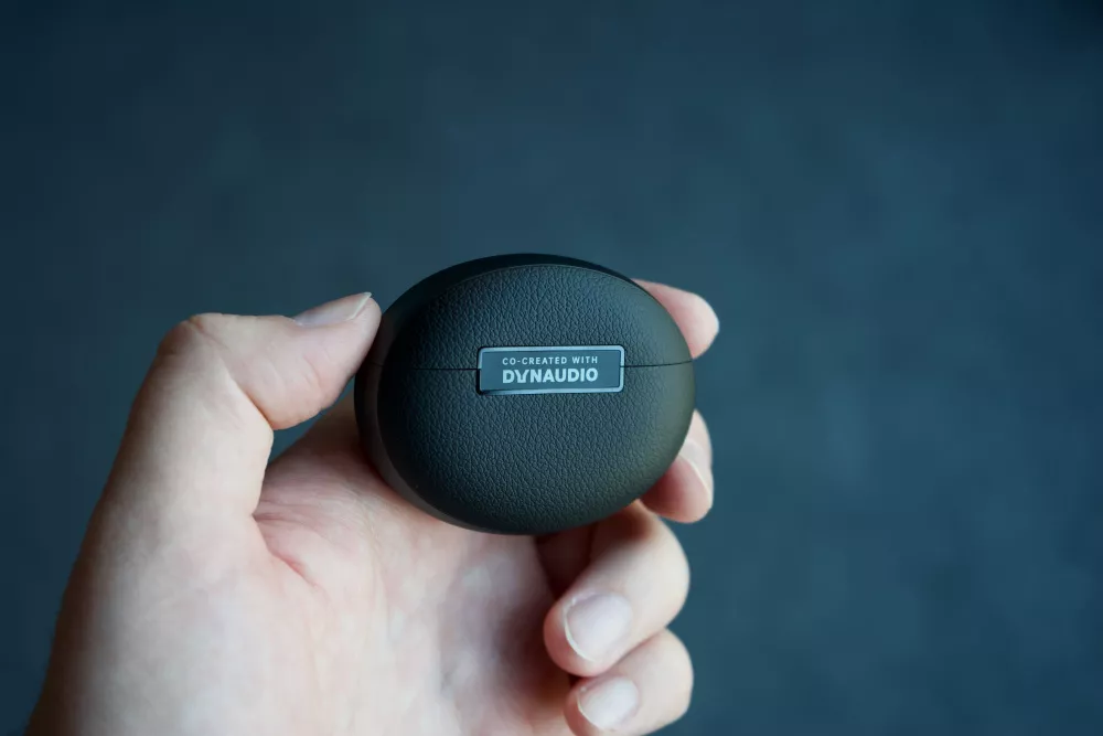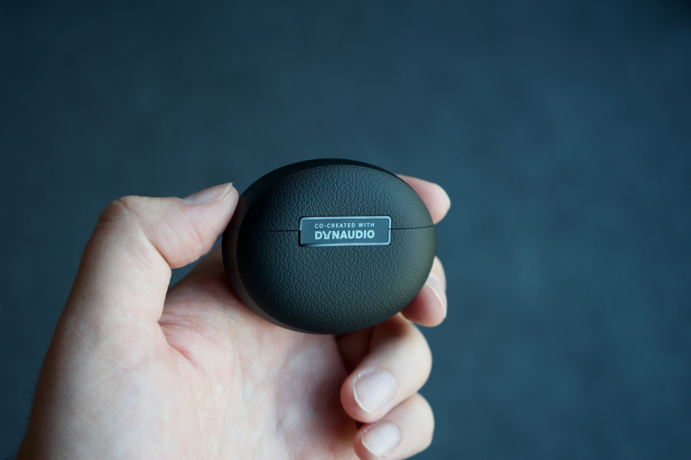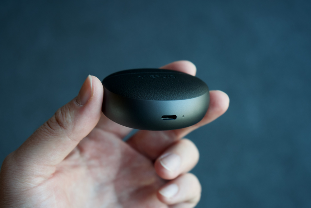 Зарядный кейс овальной формы. Он изготовлен из матового пластика, а спереди и сзади нанесена текстура, имитирующая кожу. Снизу расположился порт USB-С и индикатор состояния, а еще один дополнительный спрятался под крышкой.