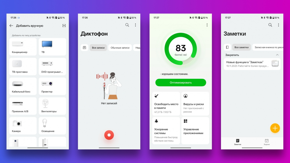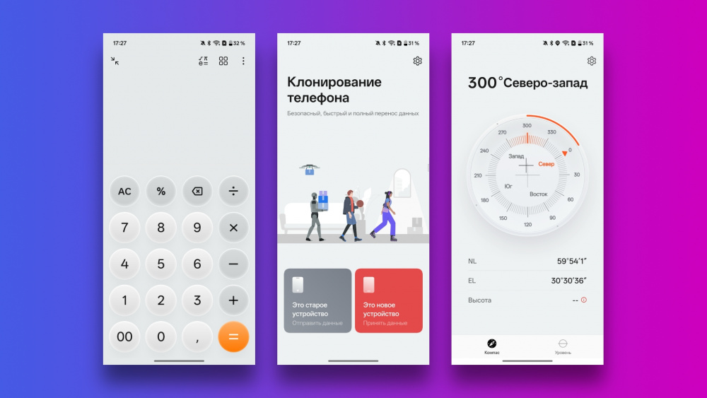 Из фирменных приложений предлагается использовать: погоду, камеру, галерею, видеоплеер, виртуальный ПДУ, диктофон, диспетчер телефона (оптимизация, проверки на вирусы), заметки, калькулятор, клонирование телефона (для переноса данных со старого устройства или для переезда на новый гаджет) и компас.