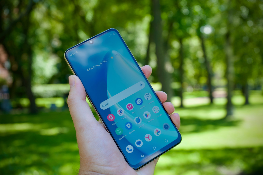 Полезная площадь экрана — 90,3%. По бокам рамки довольно тонкие, но не обошлось без заметного подбородка. В верхней части по центру расположен каплевидный вырез под фронтальную камеру.