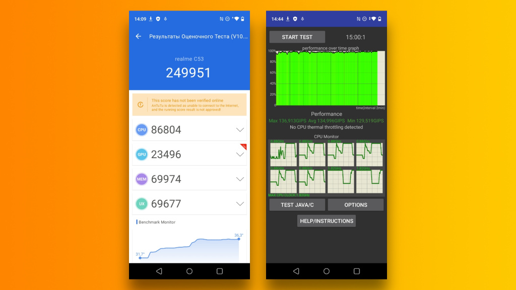 Мы замерили производительность с помощью бенчмарка AnTuTu, а также проверили гаджет в CPU Throttling Test. С результатами вы можете ознакомиться на скриншотах ниже.