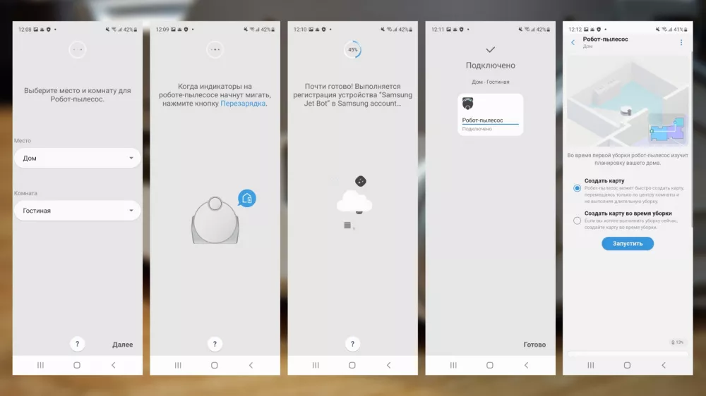 Для полноценного управления всеми функциями Samsung Jet Bot AI+ нужно установить приложение SmartThings на смартфон. Затем запустить его и перейти в раздел «Устройства» — здесь происходит активация робота-пылесоса. Во время поэтапной настройки сервис предложит выбрать место и комнату размещения, а после этого начнется привязка к Samsung-аккаунту. По завершению всех необходимых настроек Jet Bot AI+ приветствует пользователя и предлагает сделать первый запуск. Можно выбрать одну из двух опций: