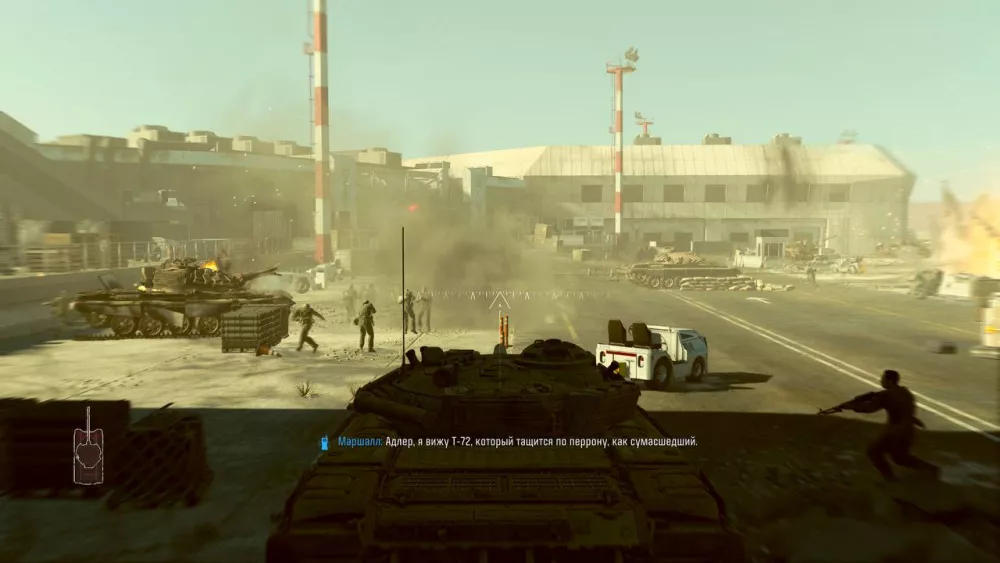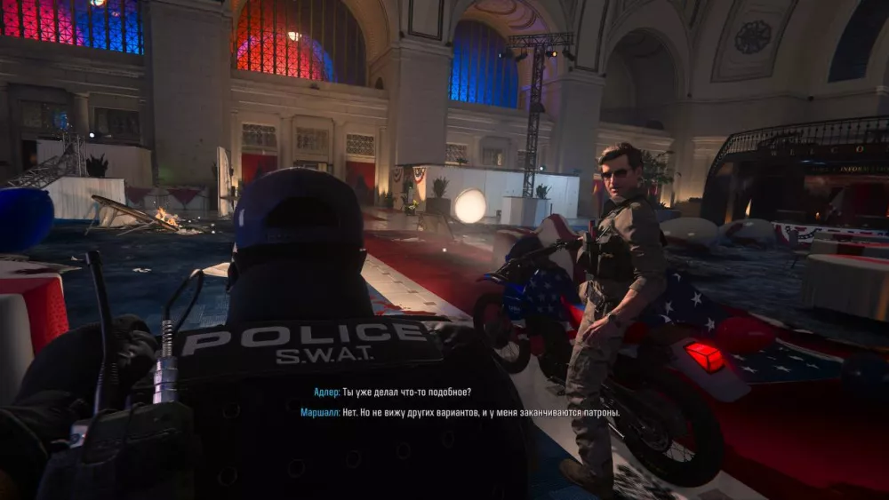 При этом создатели очень грамотно подали общий ритм игры. Вооруженные стычки не раз сменяются откровенно душными отрезками, но никогда не завершаются скучно. Например, можно добрые полчаса перебирать ветки диалогов с важными шишками, и только глаза начинают закатываться от скуки, геймплей перехватывает инициативу и вы несетесь на байке по крышам проезжающих автомобилей или рассекаете на танке по фойе аэропорта, чтобы остановить точным выстрелом улетающий самолет.