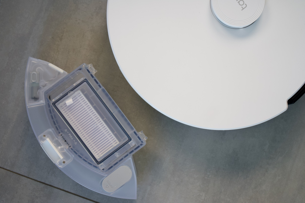 В задней поверхности корпуса размещен сдвоенный контейнер пылесборника и ёмкости для воды. В него же вставляется HEPA-фильтр, который задерживает до 99,9% аллергенов размером от 0,3 микрона и препятствует обратному выбросу пыли. На нижней поверхности Tapo RV30 можно увидеть привычное размещение компонентов. Здесь размещены направляющий ролик, пара колёсиков, вспомогательная и основная щетки, а также контакты для зарядки. Tapo RV10 Plus, на первый взгляд, внешне практически не отличается от своего «младшего брата», за исключением наличия станции самоочистки в комплекте и отсутствием башенки LiDAR на верхней поверхности пылесоса. Также у него слегка отличается сдвоенный отсек с пылесборником и ёмкостью для воды. В нём имеется специальное отверстие, через которое станция самоочистки вытягивает собранную пылесосом грязь.
