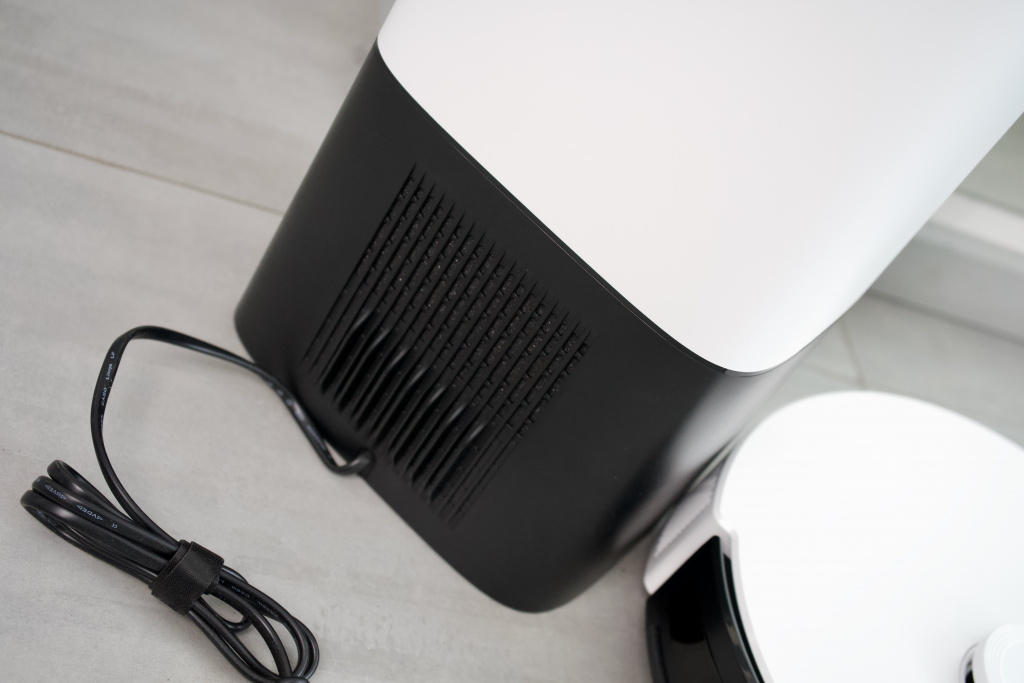 В остальном дизайн Tapo RV10 Plus идентичен модели Tapo RV30. Станция самоочистки смотрится аккуратно и минималистично. В месте пристыковки пылесоса расположены контакты для подзарядки и всасывающее отверстие. Сверху расположена крышка, которая открывает доступ к пылесборнику. В него вытягивается грязь из пылесоса после уборки. По мере заполнения его необходимо вытряхивать.