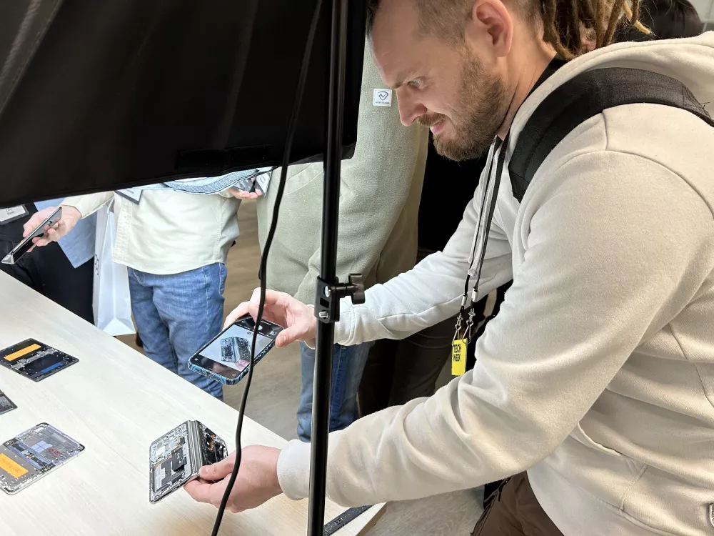 Следующим этапом ивента стала встреча с разработчиками в формате закрытой беседы. Всем участникам приготовили устройства для синхронного перевода. Первым выступил Цань Чжань (Zhang Qian) — эксперт в области создания шарниров OPPO. Специалист рассказал подробности эволюции сгибаемой конструкции, от первых прототипов до ее финальной версии, которая представлена в линейке Find N3. Зрители активно задавали вопросы и получали развернутые ответы. Во время рассказа, господин Чжань сделал акцент на тестах сгибания шарнира. По его словам конструкция выдерживает до 1 миллиона складываний. У меня возник вопрос: соответствует ли дисплей такой же степени живучести.«Вы действительно правы, что в рассказе акцент сделан на шарнире, но когда тестируется прочность устройства и какими характеристиками оно обладает, то тестируется устройство целиком. Поэтому указанная прочность касается всего устройства », — подчеркнул эксперт.