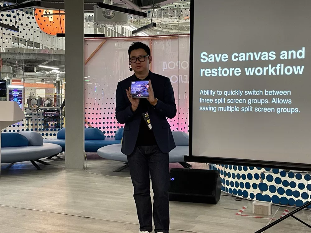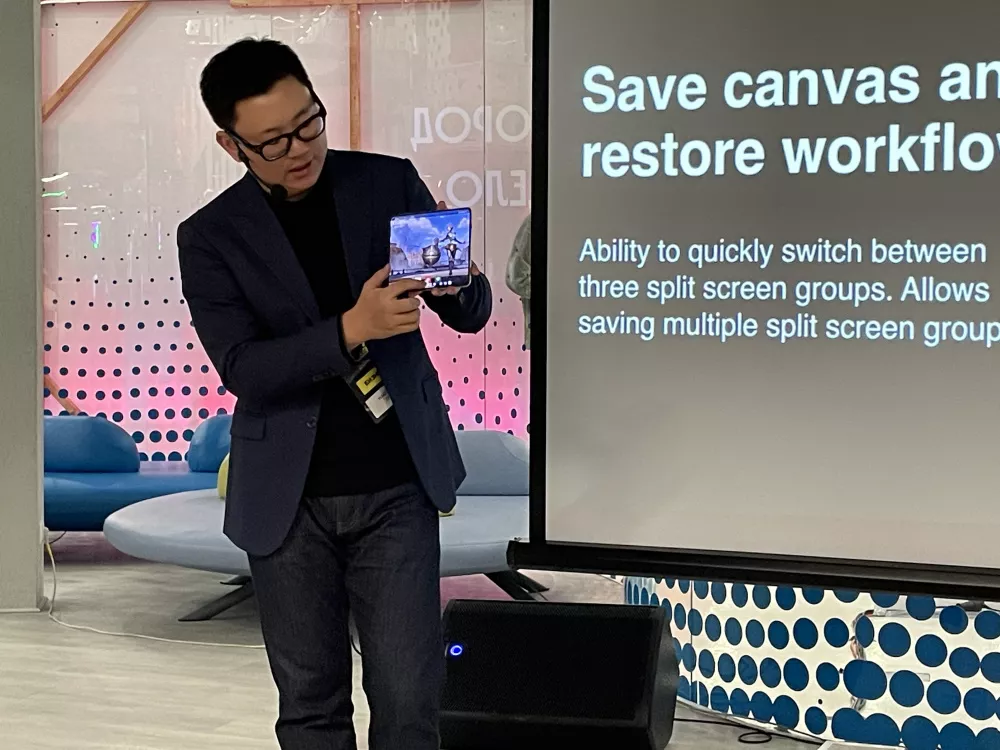 Далее микрофон перешел в руки Чжу Хайчжоу (Zhu Haizhou) — разработчику операционно системы ColorOS. Спикер уделил особое внимание многозадачности смартфонов и в частности функции Boundless View. Она позволяет запускать до трех приложений на развернутом экране. Основное занимает почти весь дисплей, а одно или два других остаются за его пределами. Их края слегка выглядывают сбоку или снизу экрана и активируются коротким свайпом. Система работает мгновенно, без тормозов и подлагиваний. Развернутые окна идеально подгоняются под рамки смартфона. Коллеги из других изданий заинтересовались вопросом, что отвечает за совместимость: оболочка ColorOS или разработчики приложений.